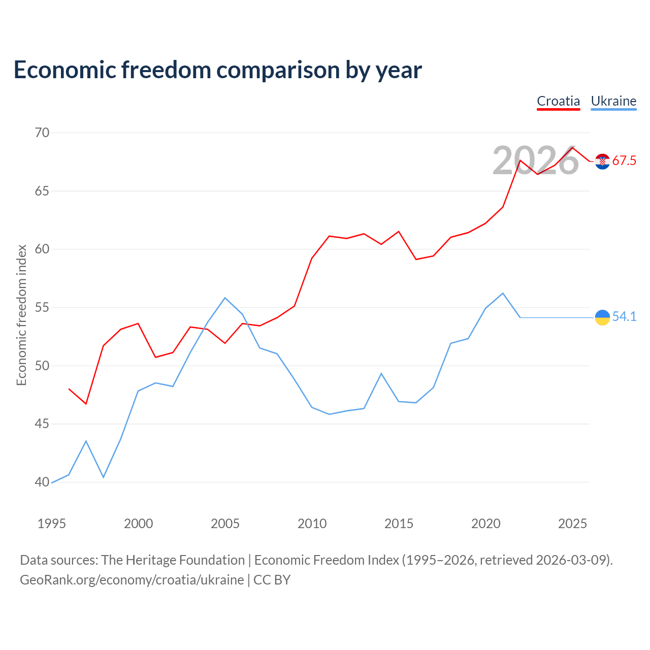 The Economic Freedom Index for Croatia is 67.5, ranking 56/197, compared to 54.1 for Ukraine, ranking 135/197. The chart above displays a comparison of annual changes in economic freedom indexes.
