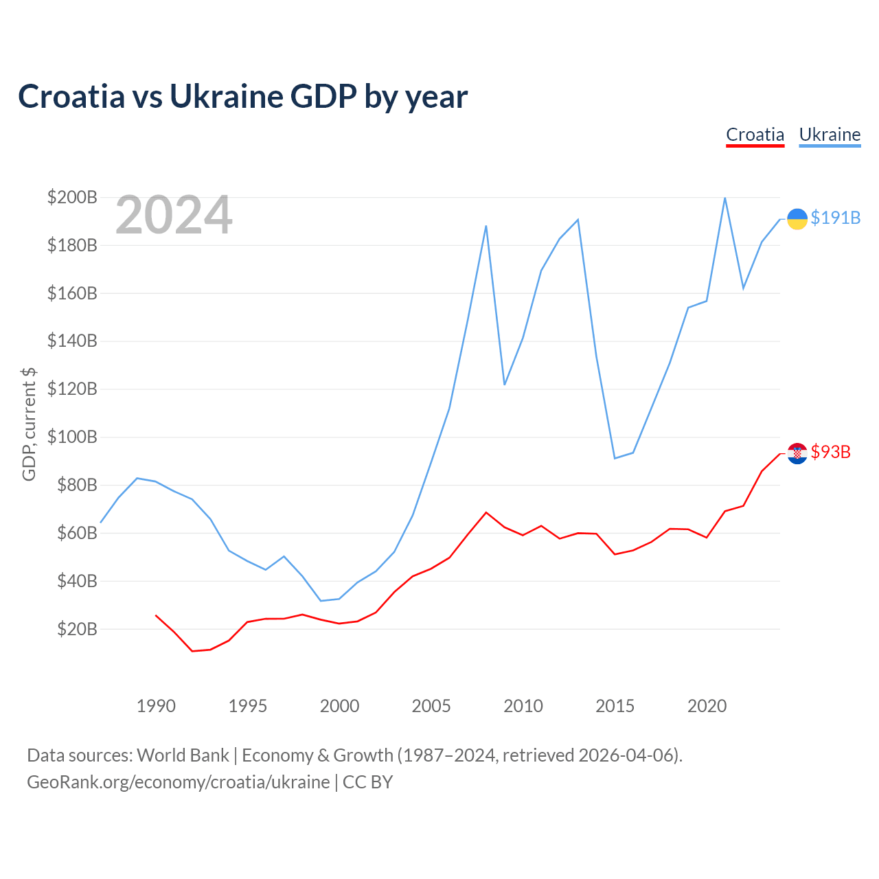 Croatia has a GDP of $93B compared to $191B for Ukraine, ranking 75/197 and 57/197 by economy size, respectively.
