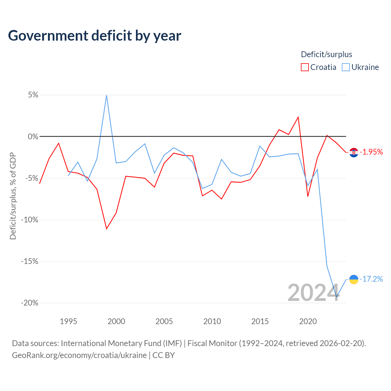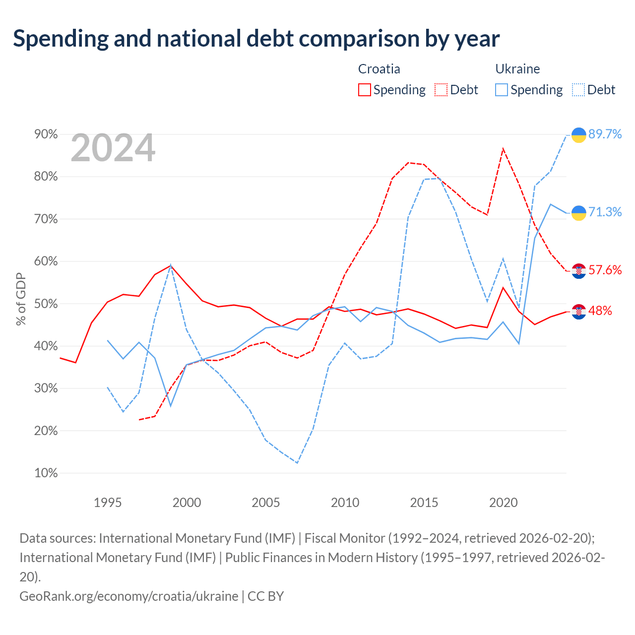 Croatia has $53.5B in government debt (57.6% of GDP), compared to $171B (89.7% of GDP) in Ukraine.