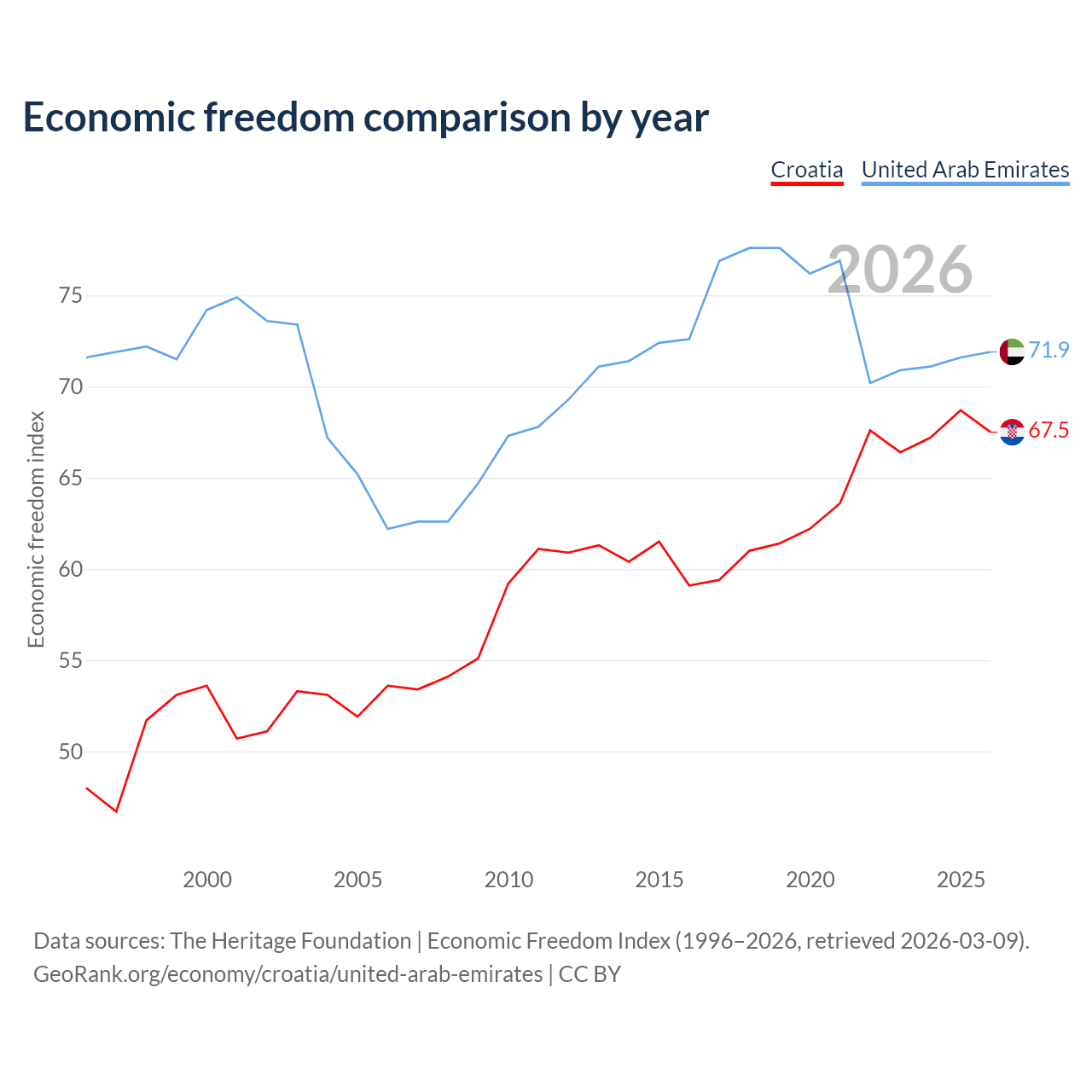 The Economic Freedom Index for Croatia is 67.5, ranking 56/197, compared to 71.9 for the United Arab Emirates, ranking 29/197. The chart above displays a comparison of annual changes in economic freedom indexes.