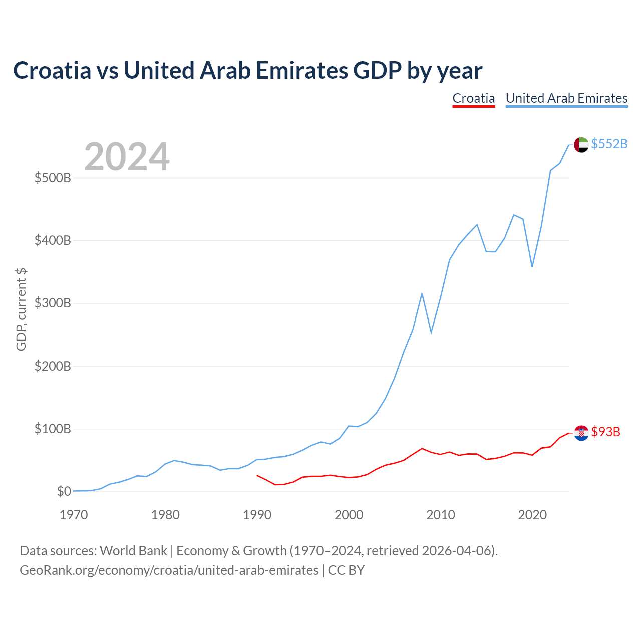 Croatia has a GDP of $93B compared to $552B for the United Arab Emirates, ranking 75/197 and 27/197 by economy size, respectively.