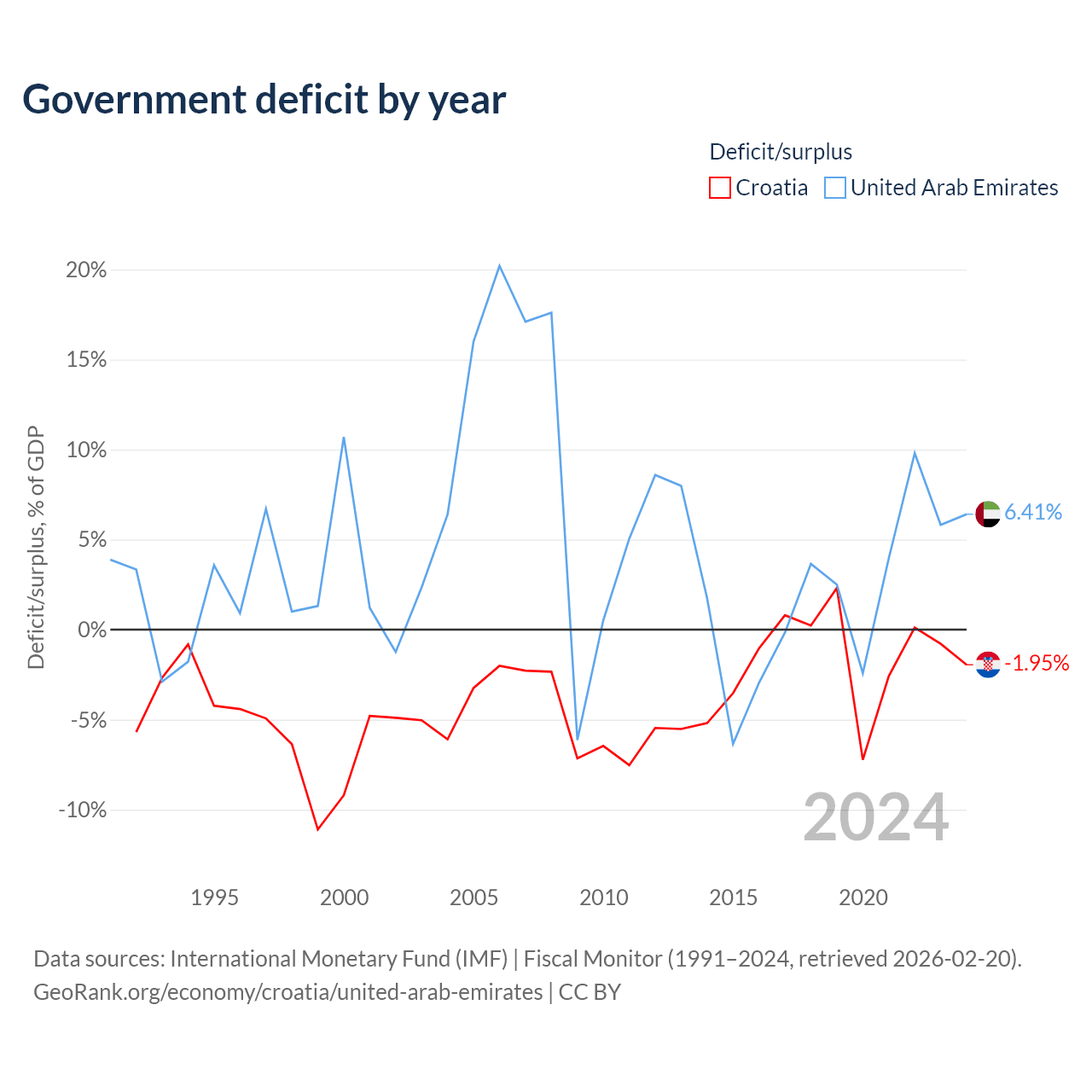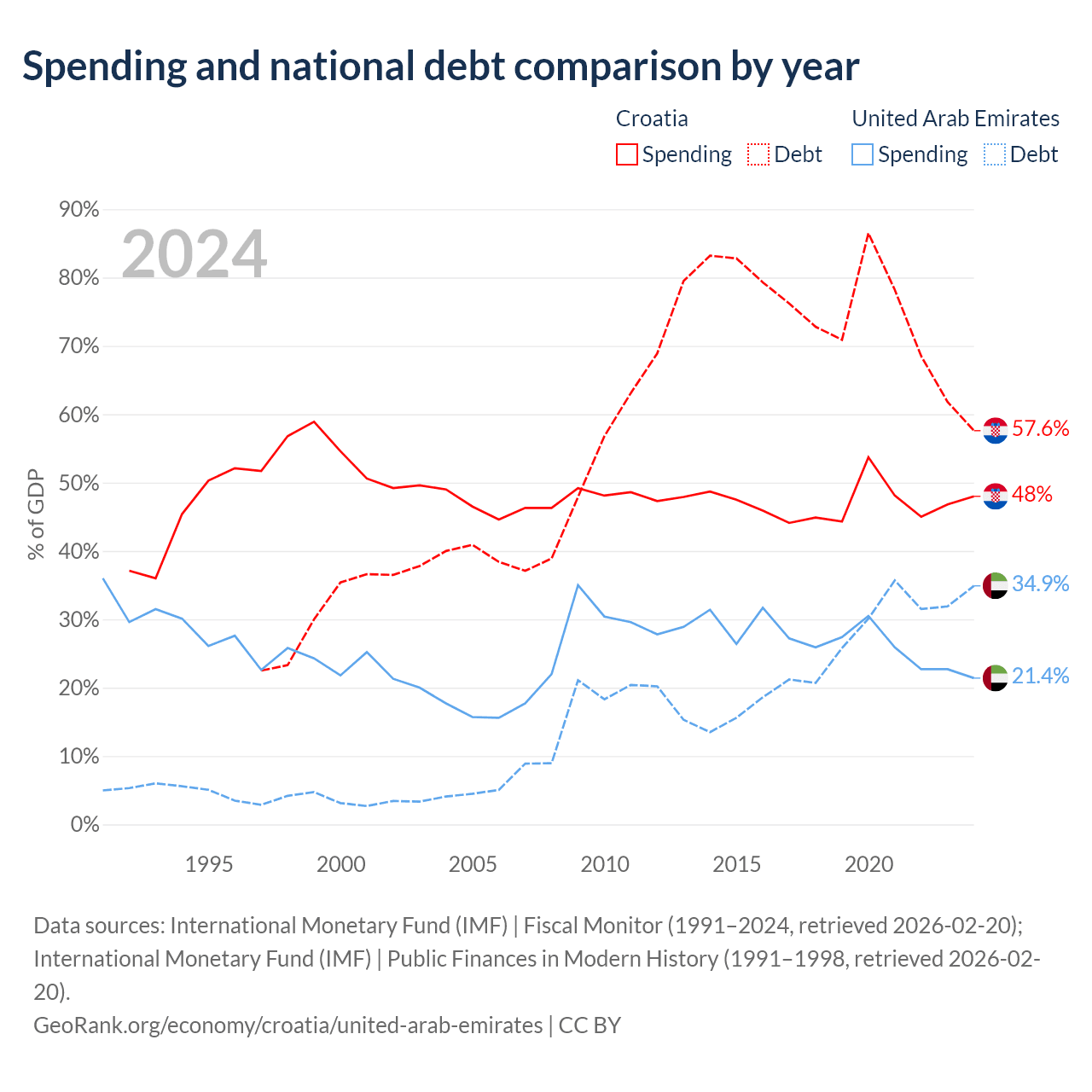 Croatia has $53.5B in government debt (57.6% of GDP), compared to $193B (34.9% of GDP) in the United Arab Emirates.