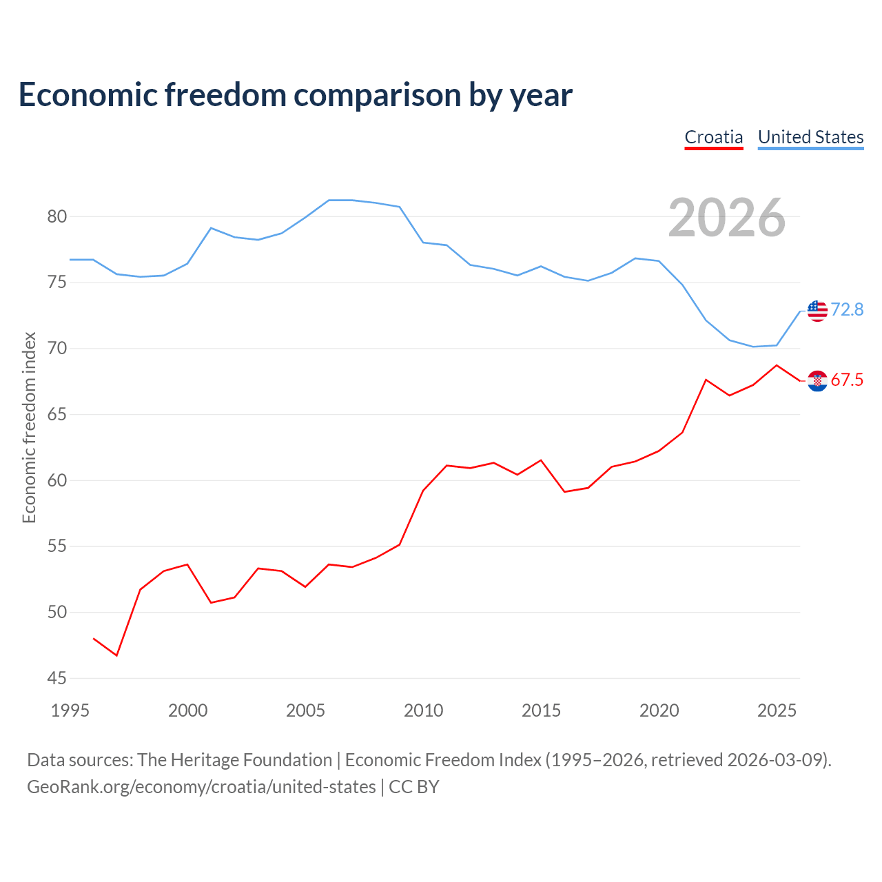 The Economic Freedom Index for Croatia is 67.5, ranking 56/197, compared to 72.8 for the United States, ranking 27/197. The chart above displays a comparison of annual changes in economic freedom indexes.