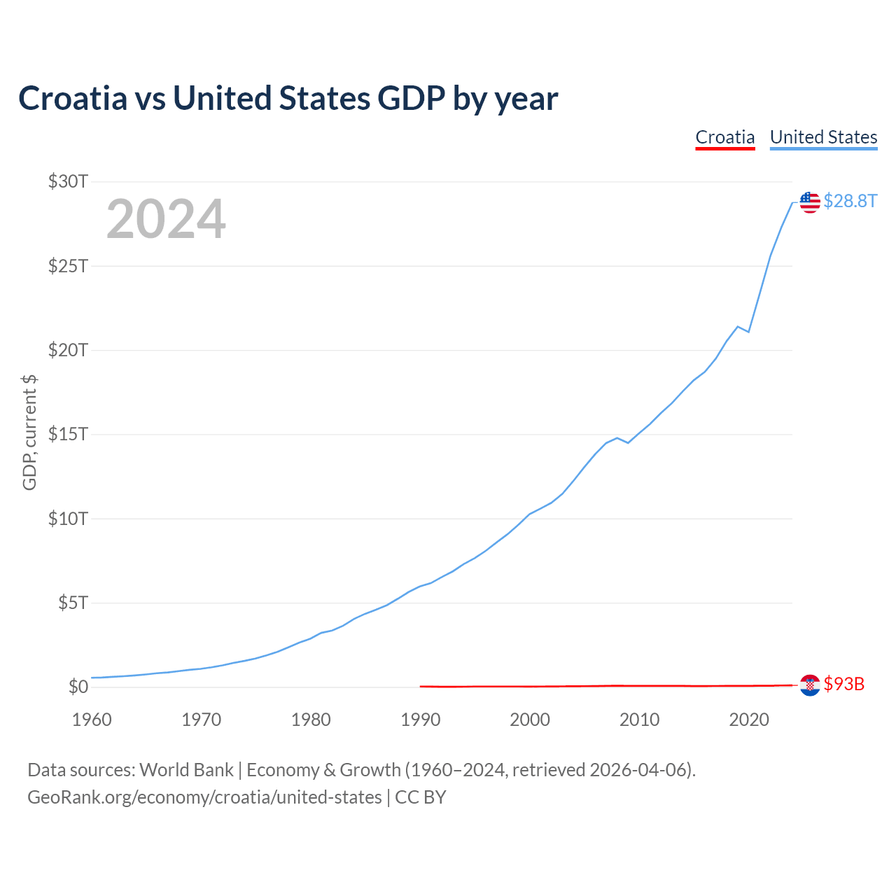 Croatia has a GDP of $93B compared to $28.8T for the United States, ranking 75/197 and 1/197 by economy size, respectively.
