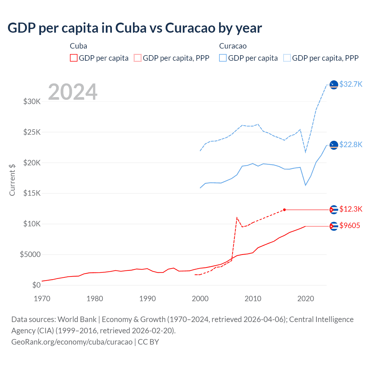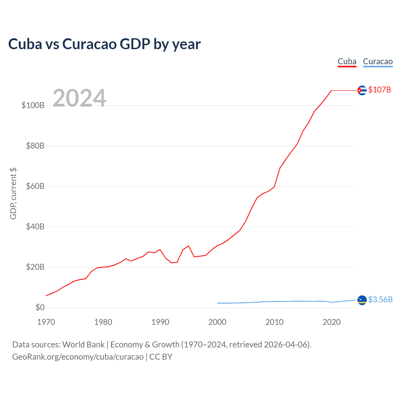 Cuba has a GDP of $107B compared to $3.56B for Curacao, ranking 69/197 and 167/197 by economy size, respectively.