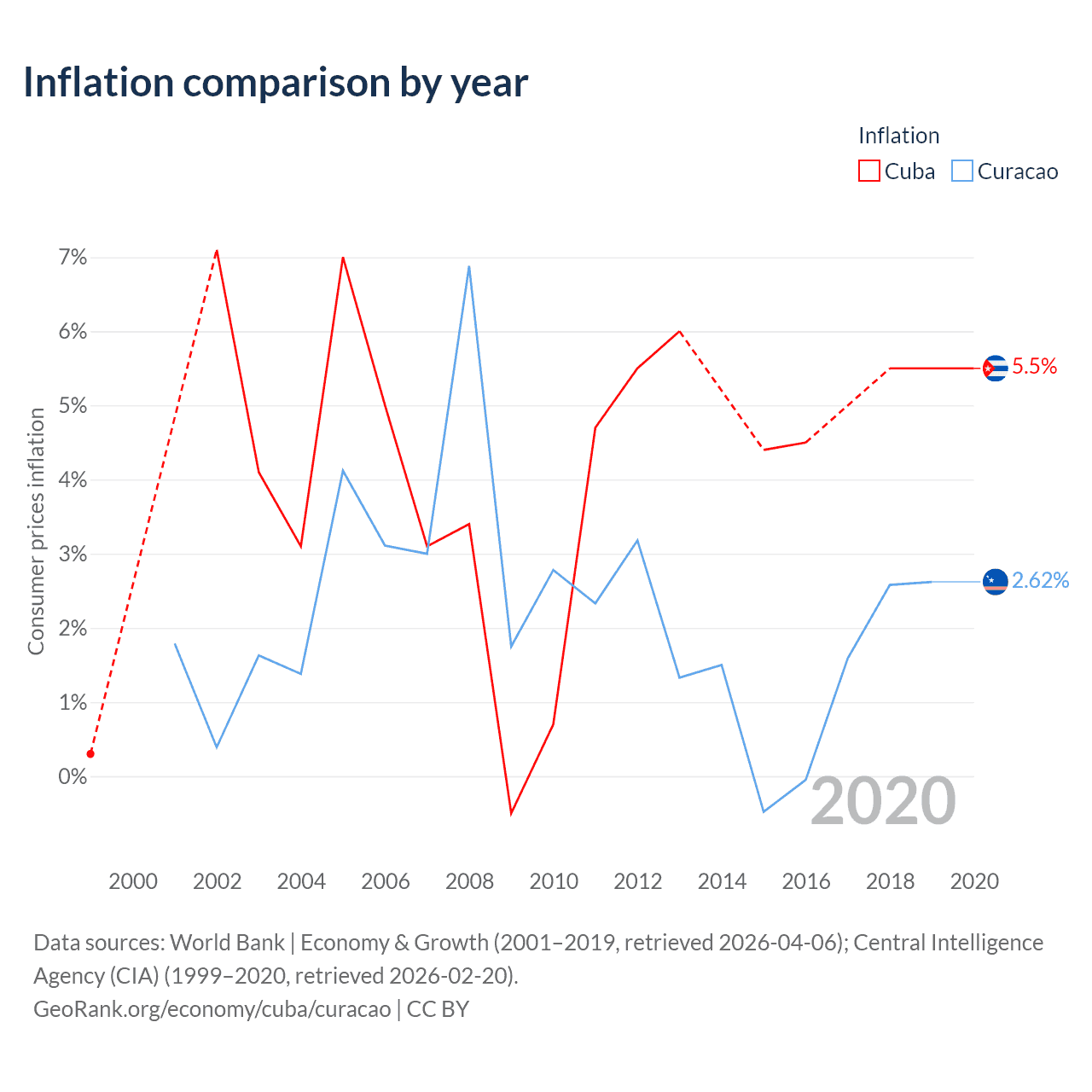 Over the past 19 years, Cuba has recorded an average annual inflation rate of 4.32%, compared with 2.18% in Curacao. In 2019, inflation was 5.5% in Cuba and 2.62% in Curacao.