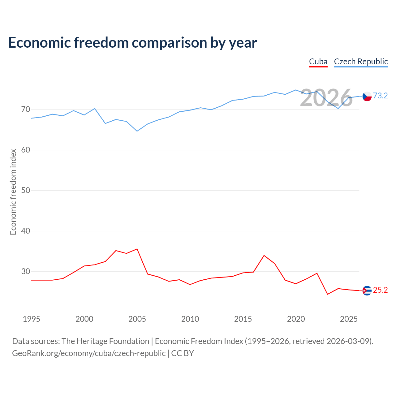 The Economic Freedom Index for Cuba is 25.2, ranking 195/197, compared to 73.2 for the Czech Republic, ranking 25/197. The chart above displays a comparison of annual changes in economic freedom indexes.
