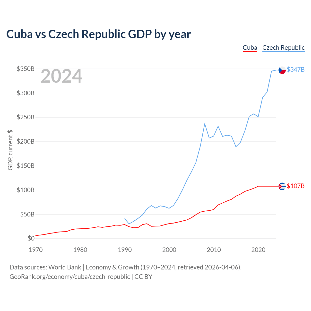 Cuba has a GDP of $107B compared to $347B for the Czech Republic, ranking 69/197 and 44/197 by economy size, respectively.