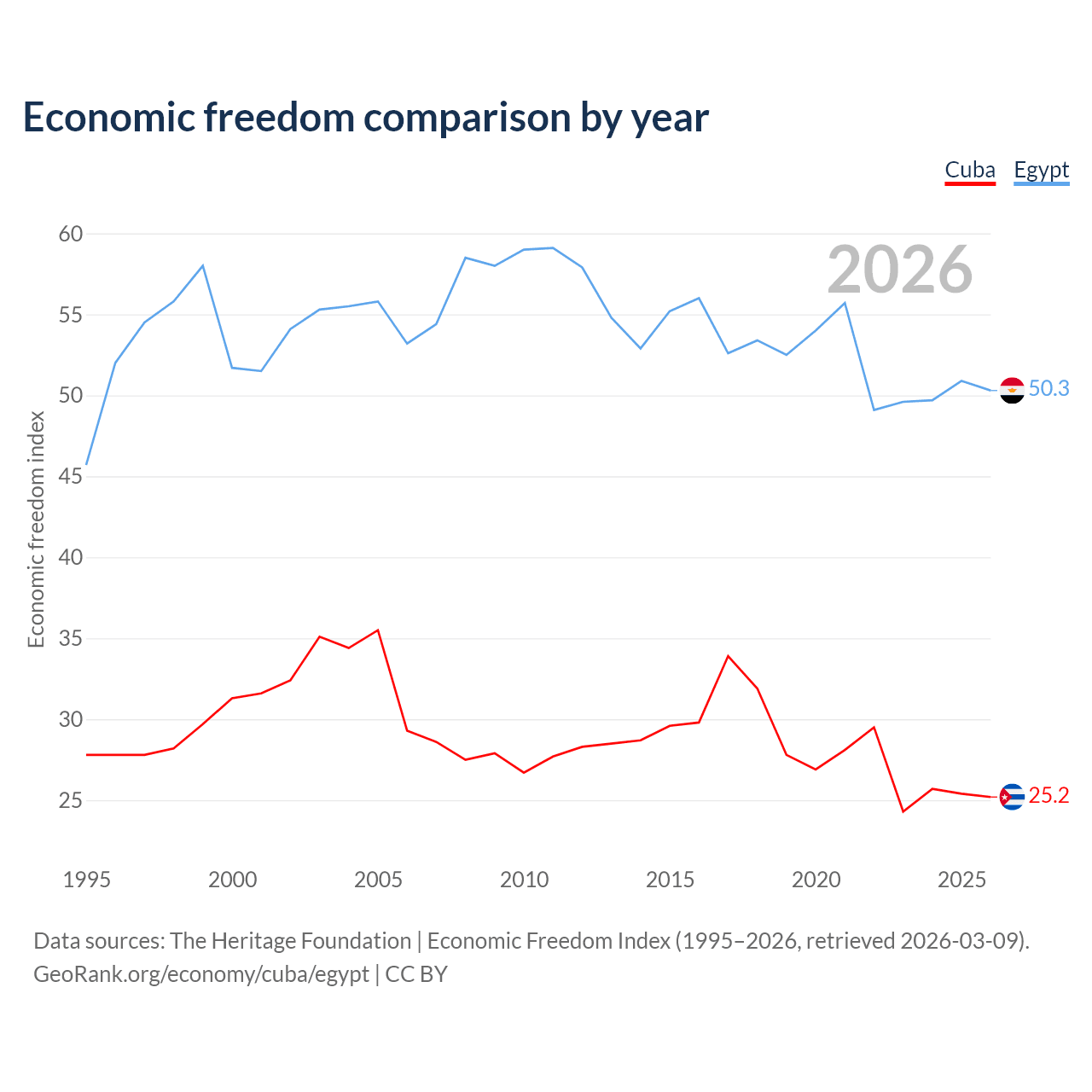 The Economic Freedom Index for Cuba is 25.2, ranking 195/197, compared to 50.3 for Egypt, ranking 160/197. The chart above displays a comparison of annual changes in economic freedom indexes.