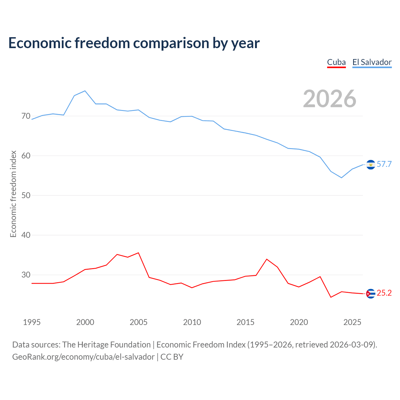 The Economic Freedom Index for Cuba is 25.2, ranking 195/197, compared to 57.7 for El Salvador, ranking 114/197. The chart above displays a comparison of annual changes in economic freedom indexes.