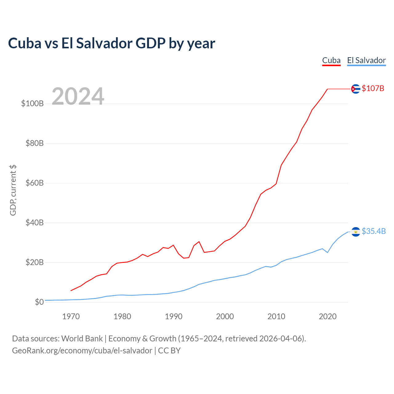 Cuba has a GDP of $107B compared to $35.4B for El Salvador, ranking 69/197 and 105/197 by economy size, respectively.