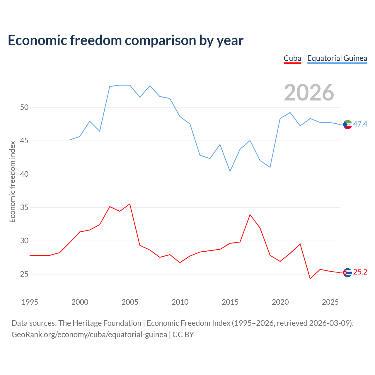 The Economic Freedom Index for Cuba is 25.2, ranking 195/197, compared to 47.4 for Equatorial Guinea, ranking 175/197. The chart above displays a comparison of annual changes in economic freedom indexes.