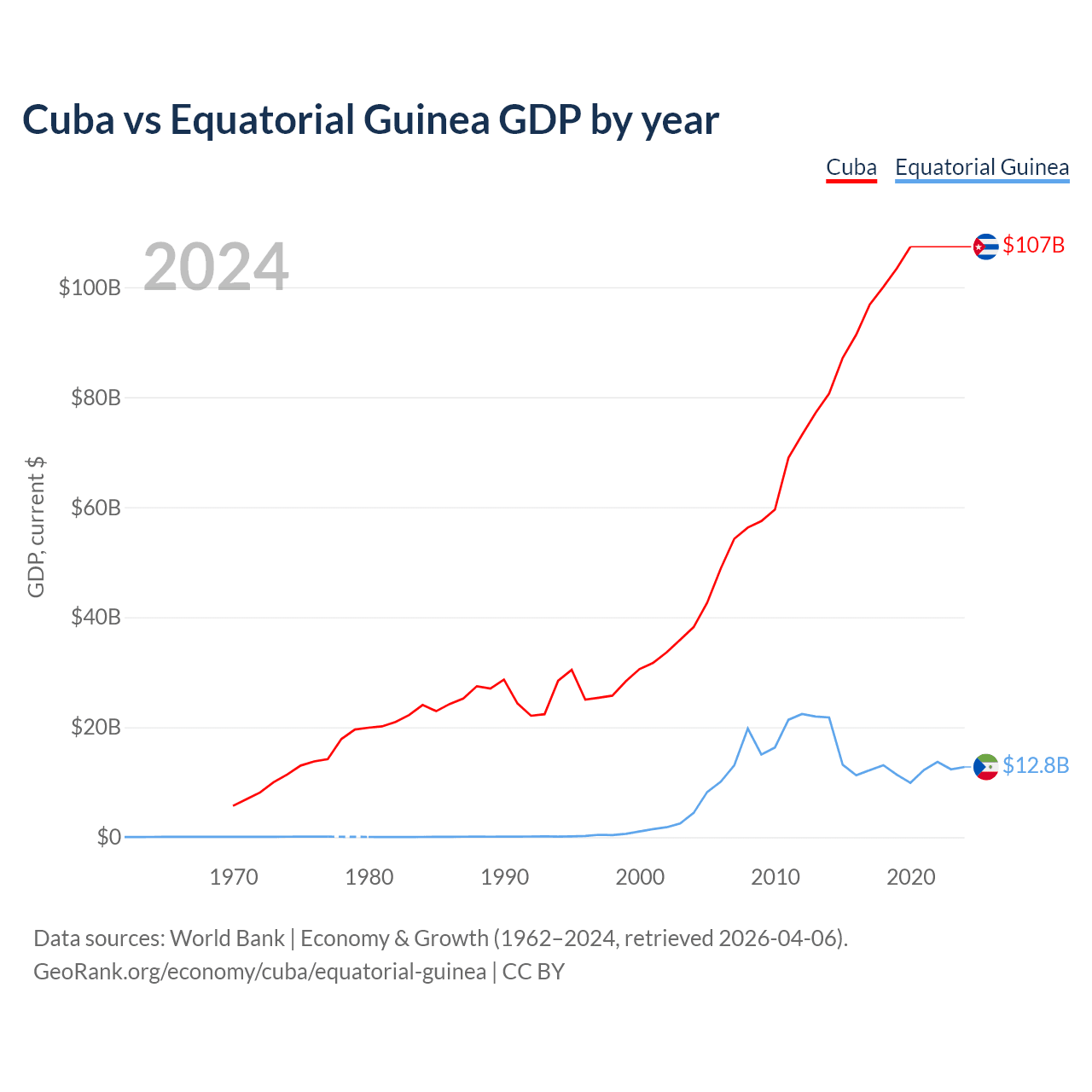 Cuba has a GDP of $107B compared to $12.8B for Equatorial Guinea, ranking 69/197 and 148/197 by economy size, respectively.