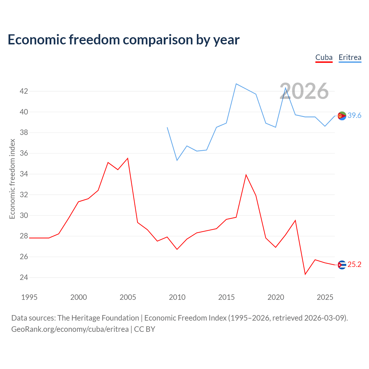 The Economic Freedom Index for Cuba is 25.2, ranking 195/197, compared to 39.6 for Eritrea, ranking 188/197. The chart above displays a comparison of annual changes in economic freedom indexes.