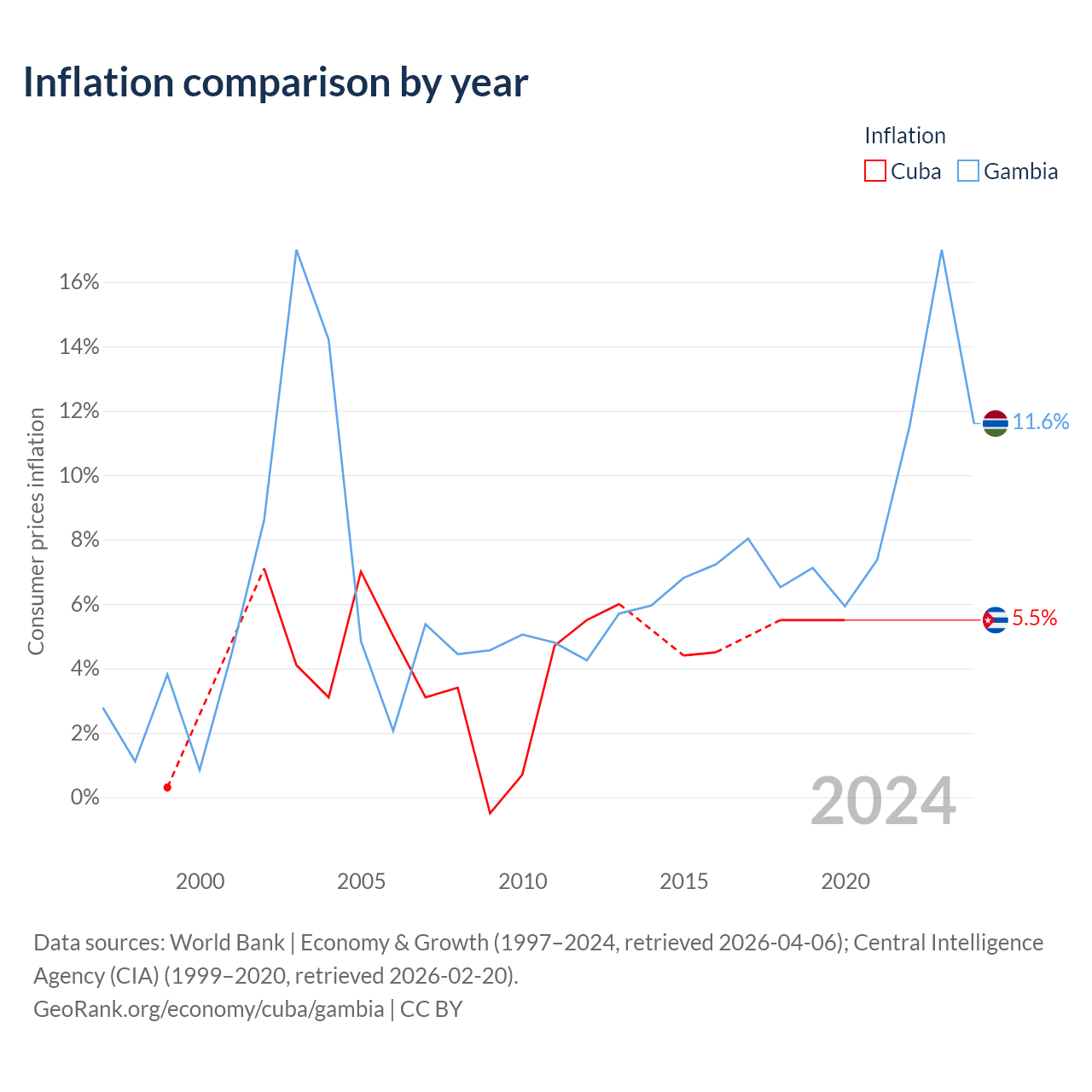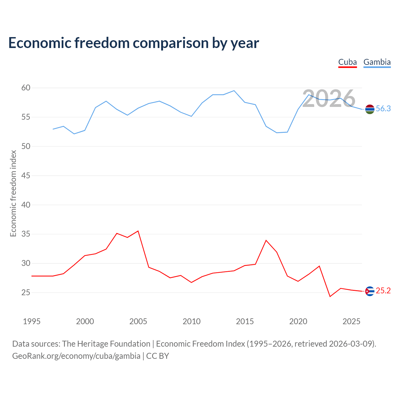 The Economic Freedom Index for Cuba is 25.2, ranking 195/197, compared to 56.3 for the Gambia, ranking 123/197. The chart above displays a comparison of annual changes in economic freedom indexes.