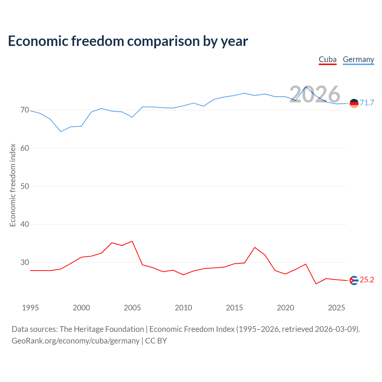 The Economic Freedom Index for Cuba is 25.2, ranking 195/197, compared to 71.7 for Germany, ranking 30/197. The chart above displays a comparison of annual changes in economic freedom indexes.