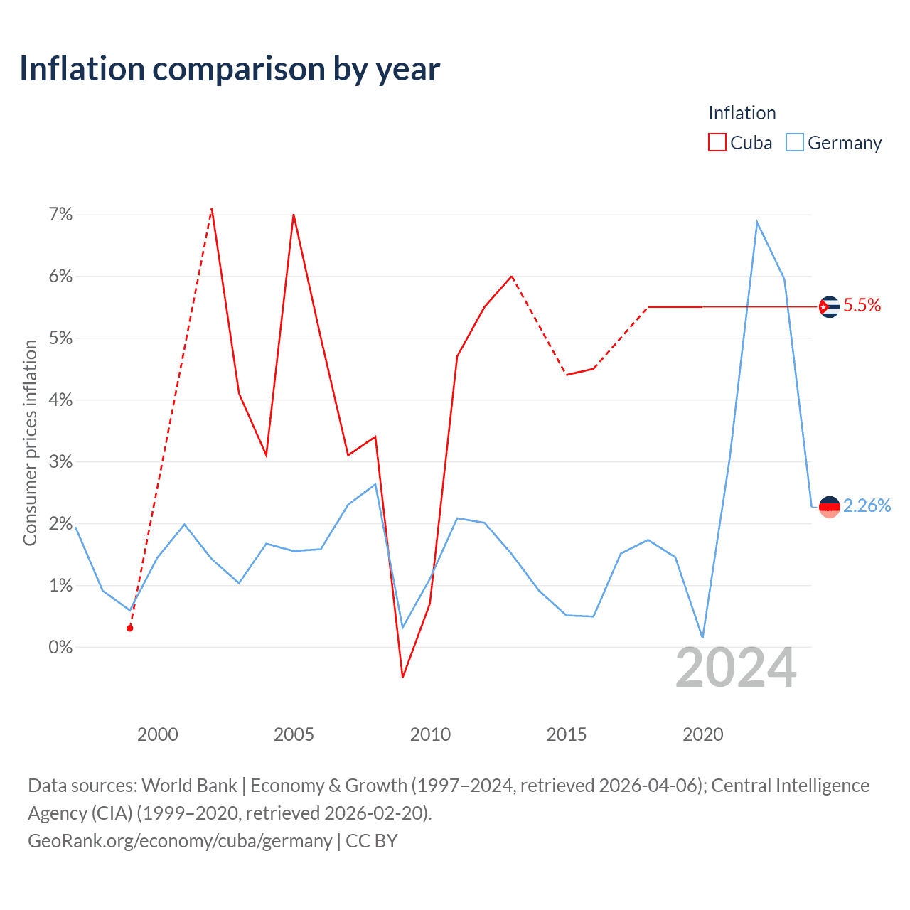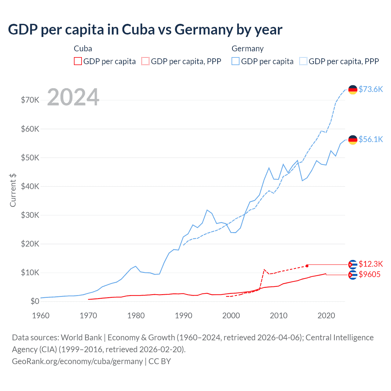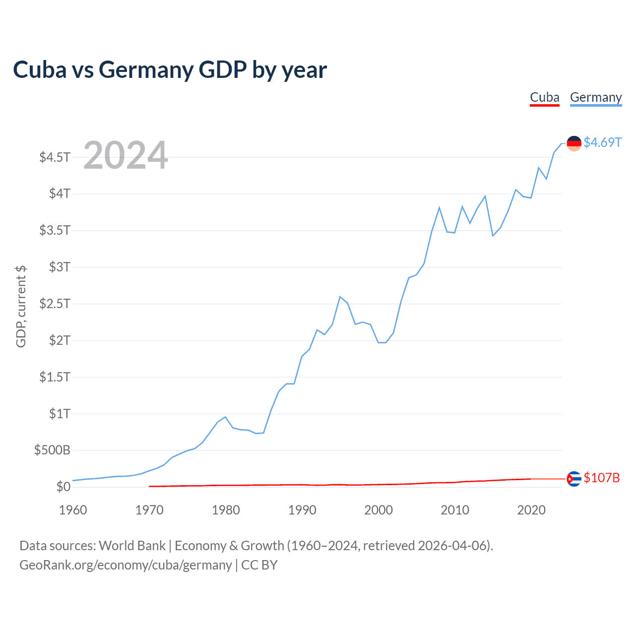 Cuba has a GDP of $107B compared to $4.69T for Germany, ranking 69/197 and 3/197 by economy size, respectively.