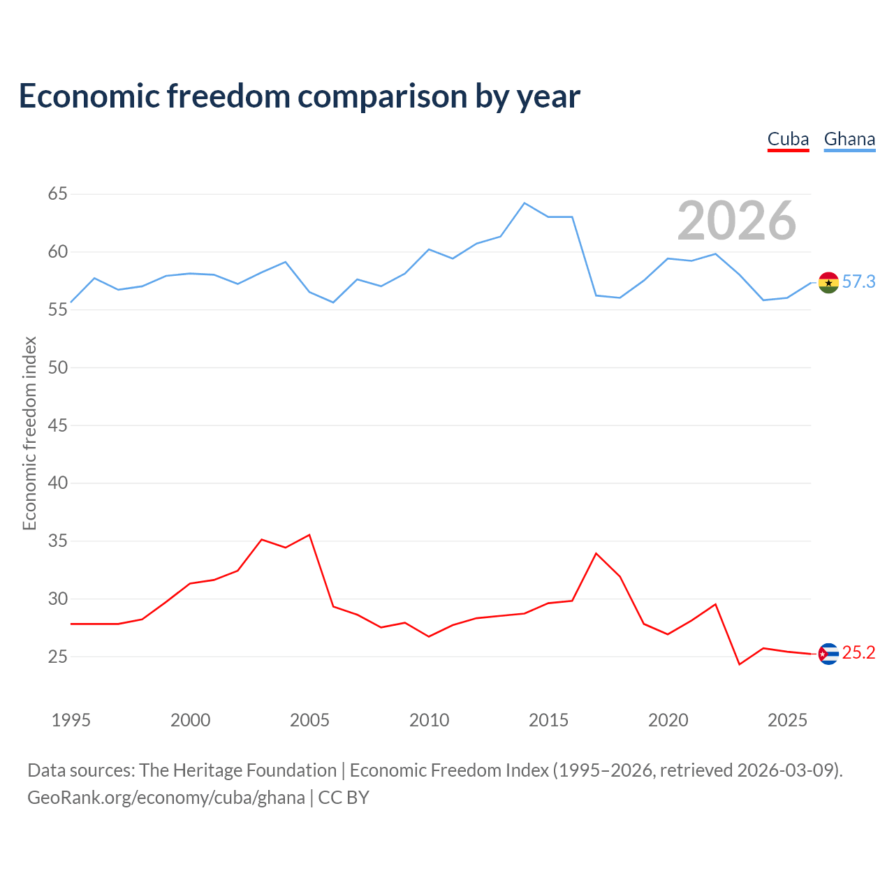 The Economic Freedom Index for Cuba is 25.2, ranking 195/197, compared to 57.3 for Ghana, ranking 118/197. The chart above displays a comparison of annual changes in economic freedom indexes.