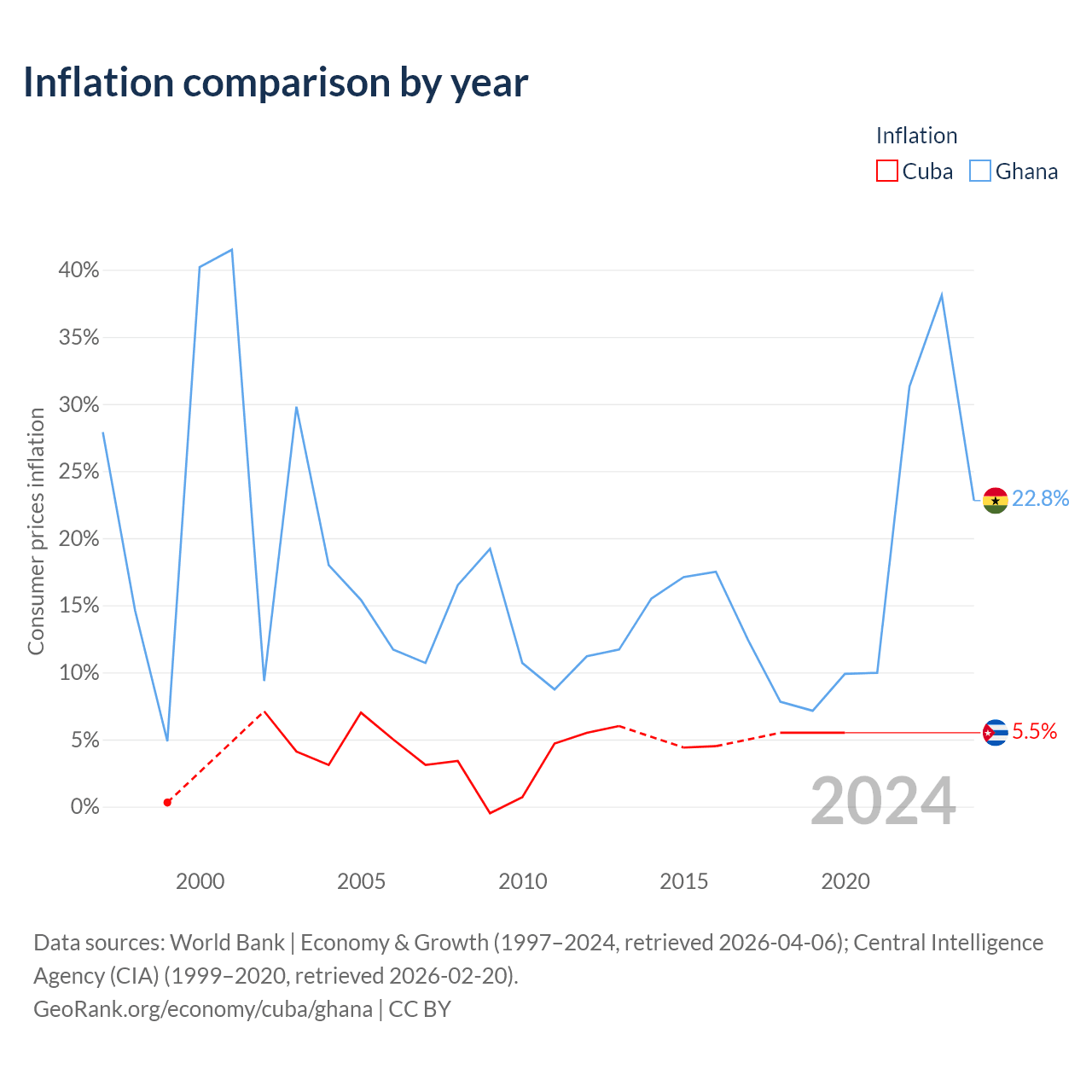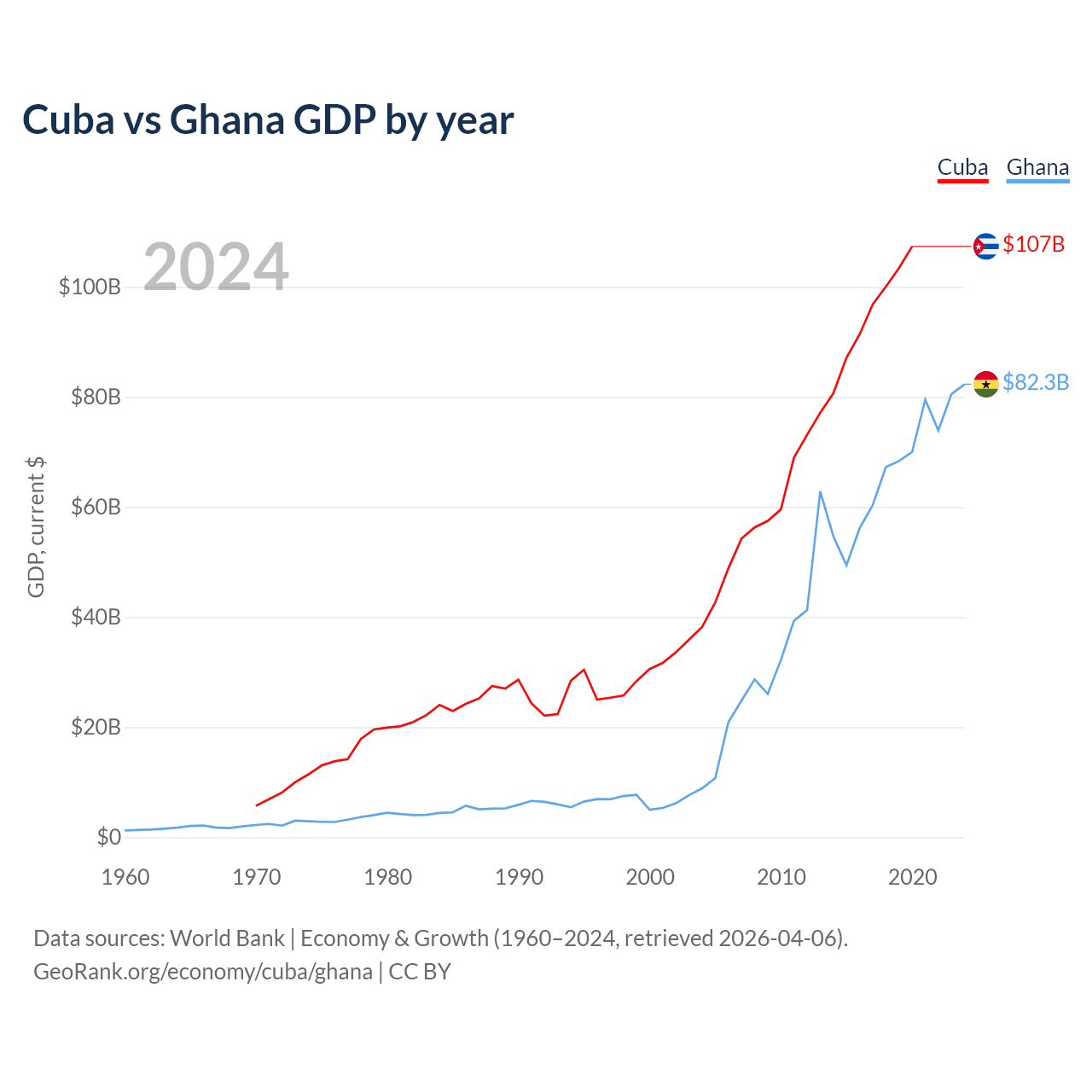 Cuba has a GDP of $107B compared to $82.3B for Ghana, ranking 69/197 and 80/197 by economy size, respectively.