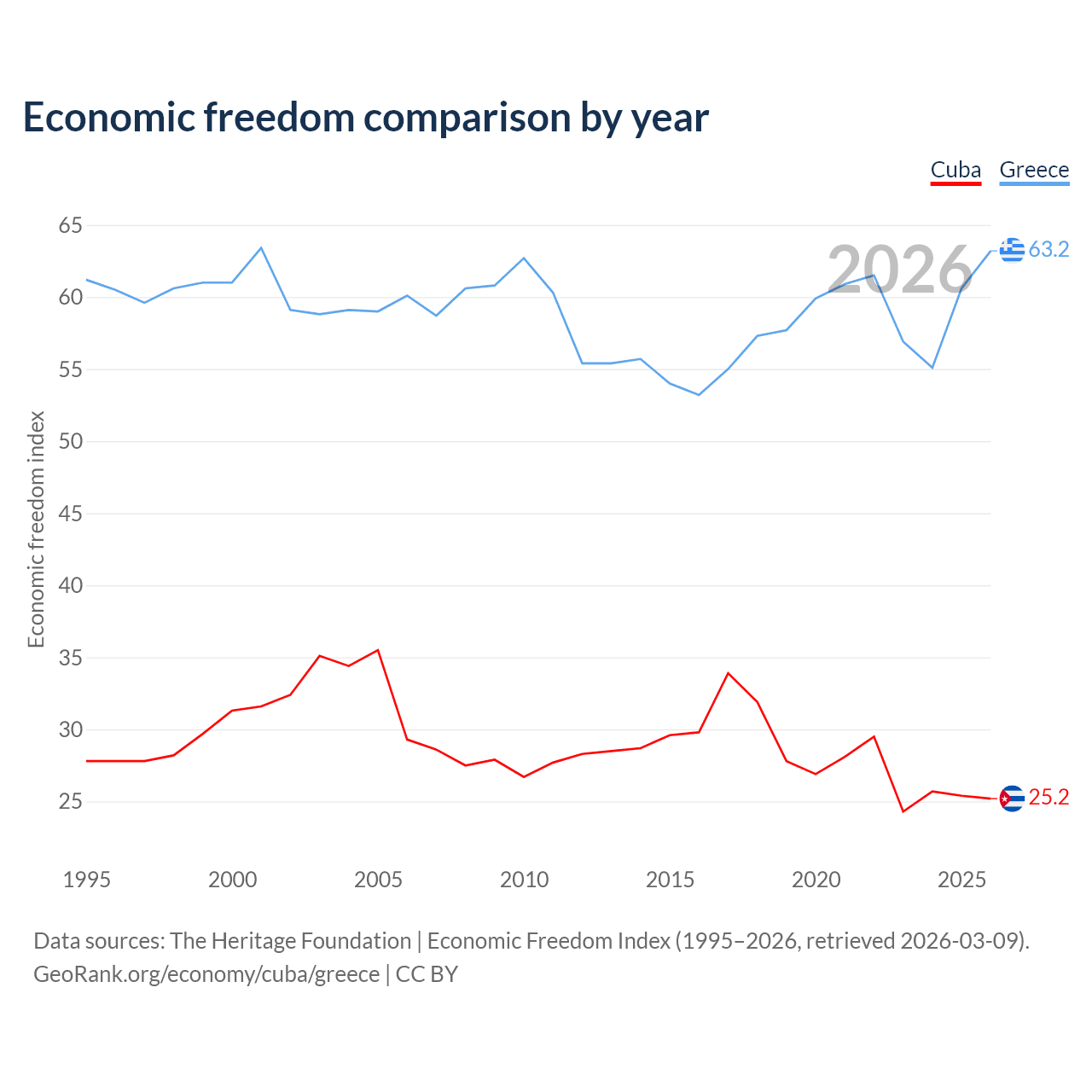 The Economic Freedom Index for Cuba is 25.2, ranking 195/197, compared to 63.2 for Greece, ranking 82/197. The chart above displays a comparison of annual changes in economic freedom indexes.