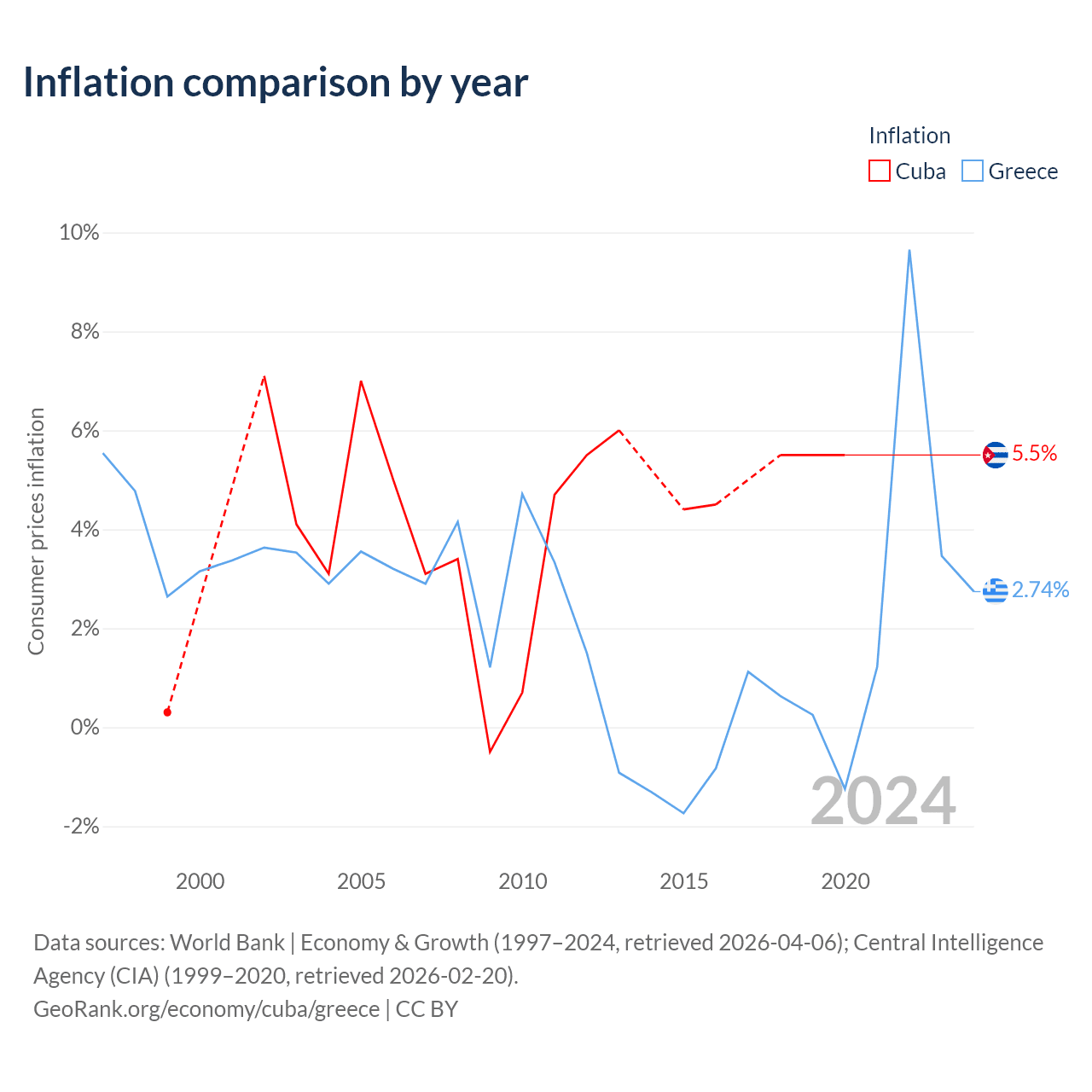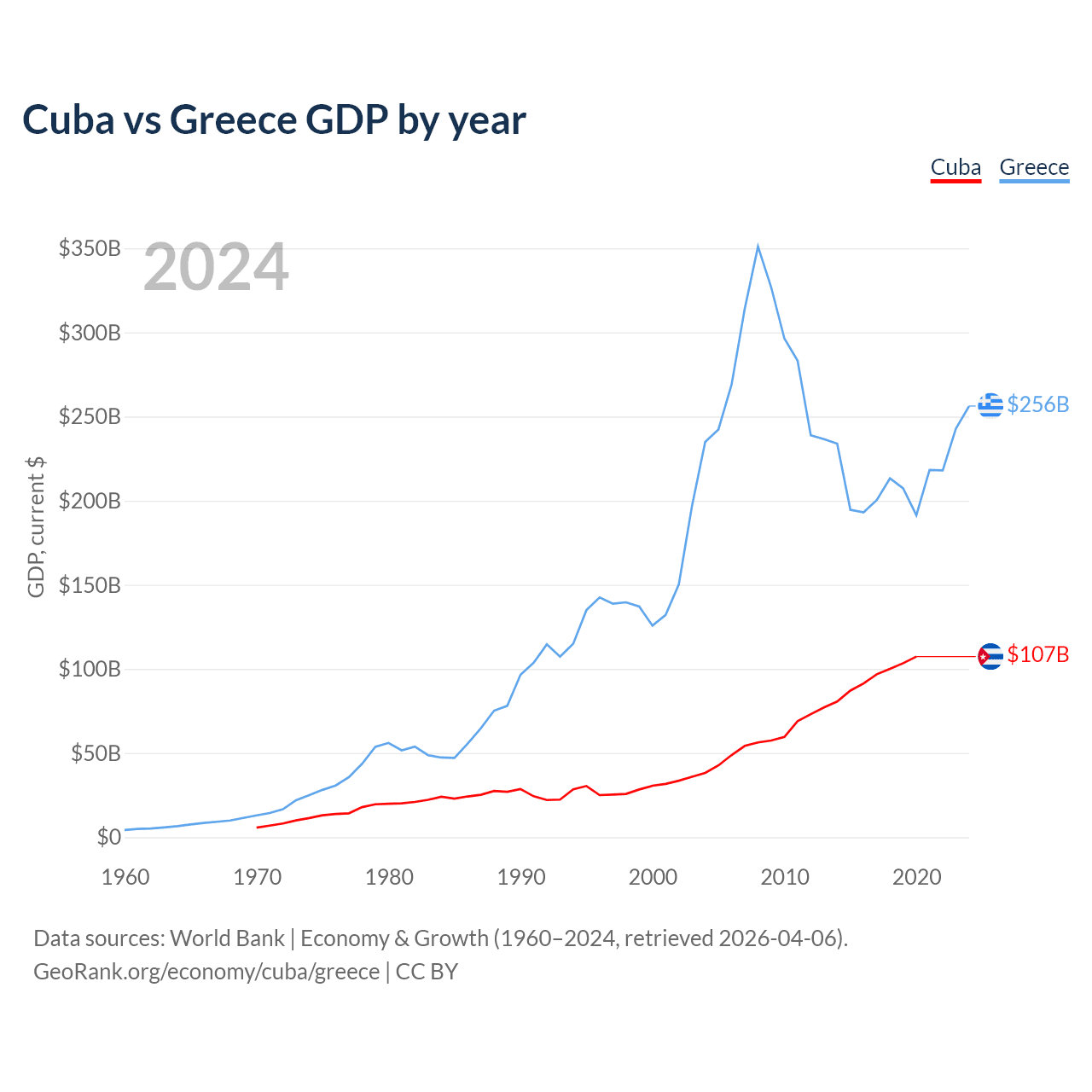 Cuba has a GDP of $107B compared to $256B for Greece, ranking 69/197 and 53/197 by economy size, respectively.