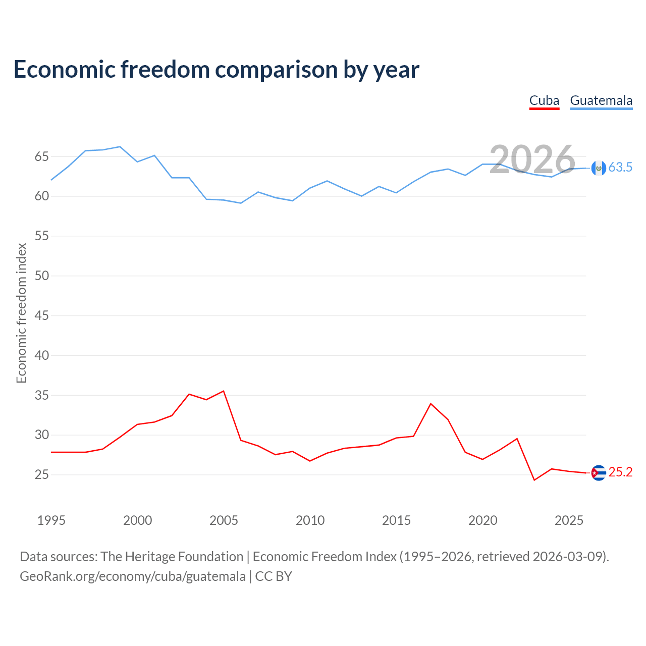 The Economic Freedom Index for Cuba is 25.2, ranking 195/197, compared to 63.5 for Guatemala, ranking 79/197. The chart above displays a comparison of annual changes in economic freedom indexes.