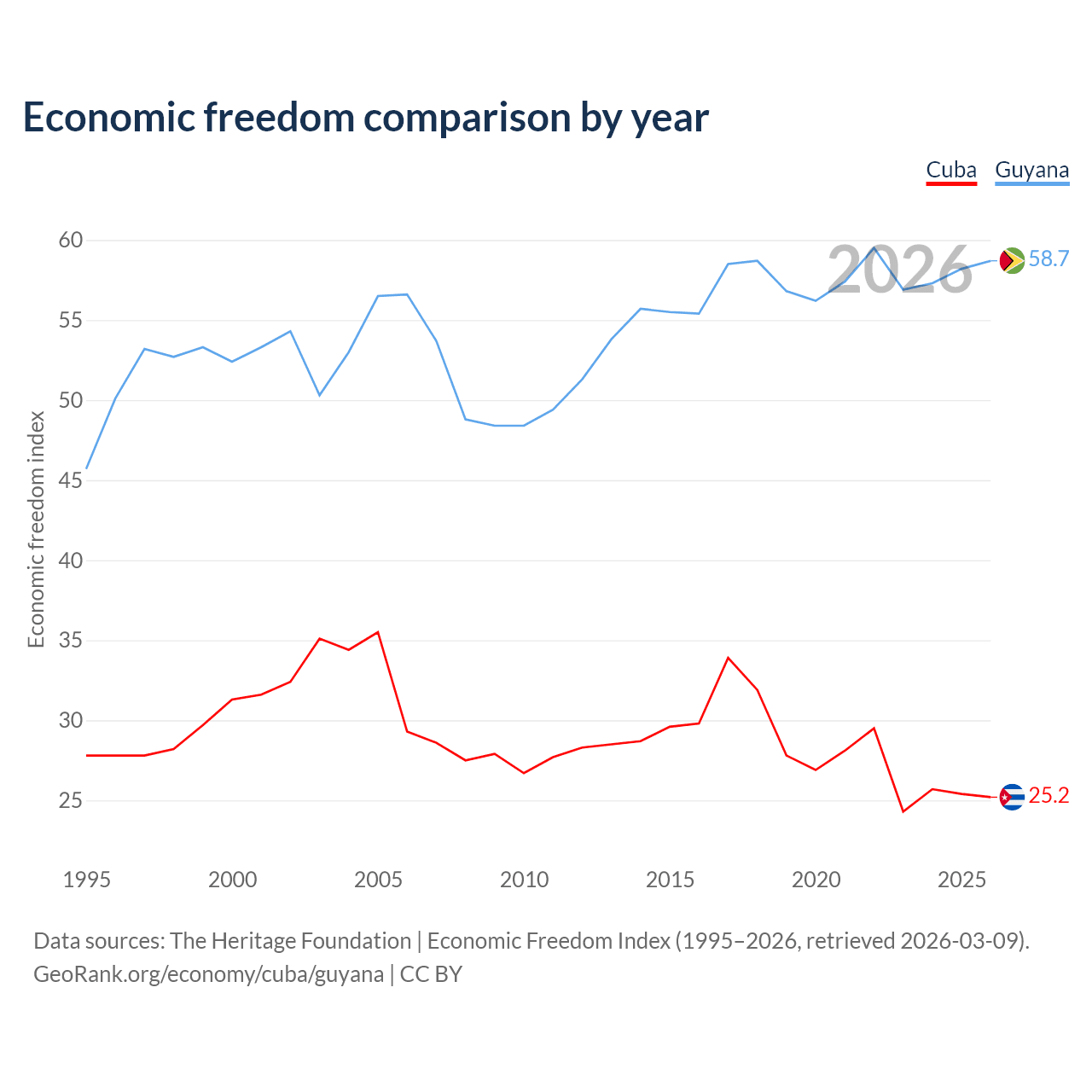The Economic Freedom Index for Cuba is 25.2, ranking 195/197, compared to 58.7 for Guyana, ranking 109/197. The chart above displays a comparison of annual changes in economic freedom indexes.