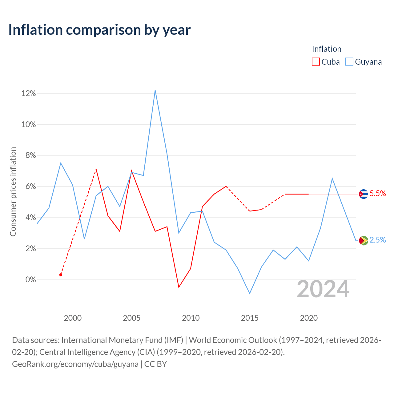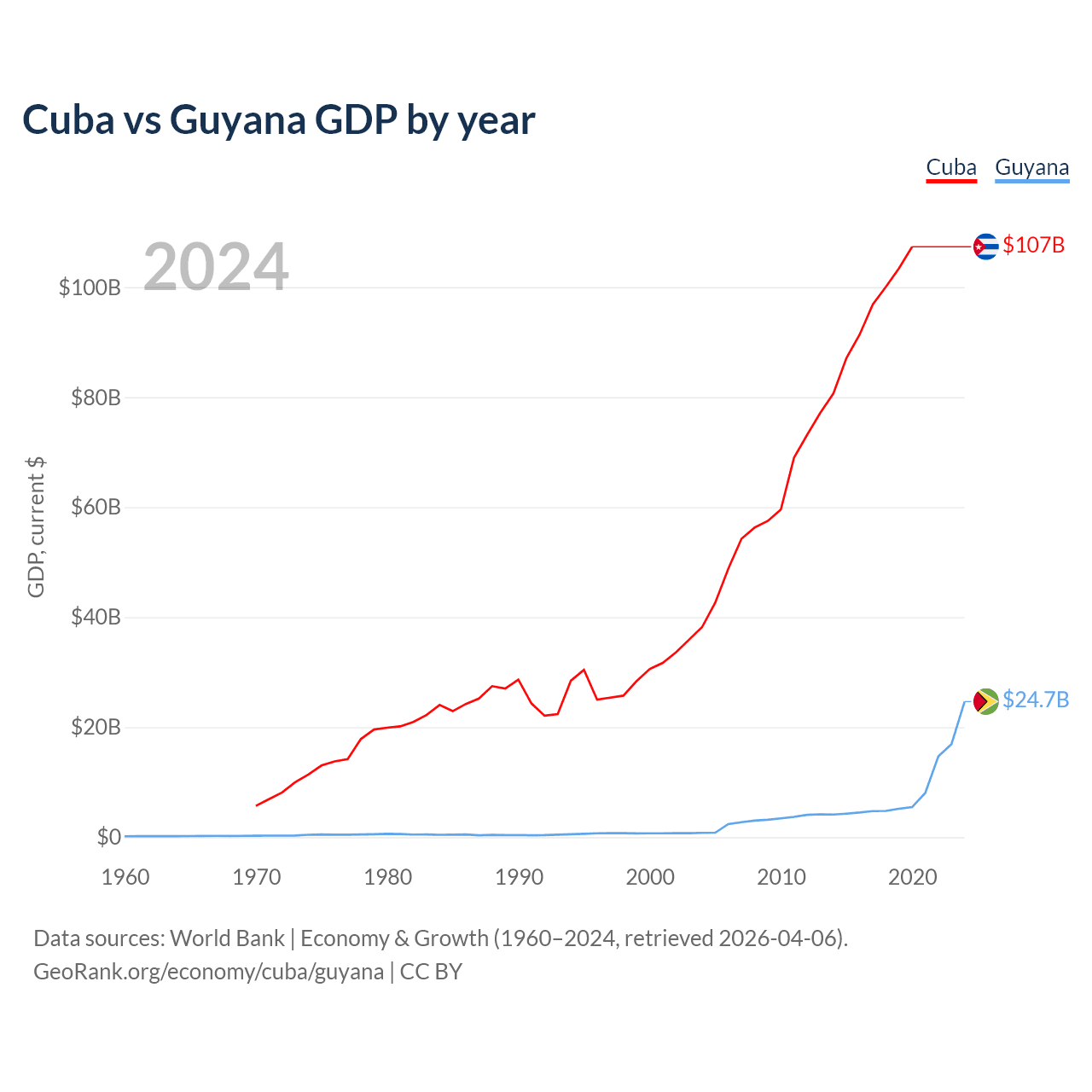 Cuba has a GDP of $107B compared to $24.7B for Guyana, ranking 69/197 and 120/197 by economy size, respectively.