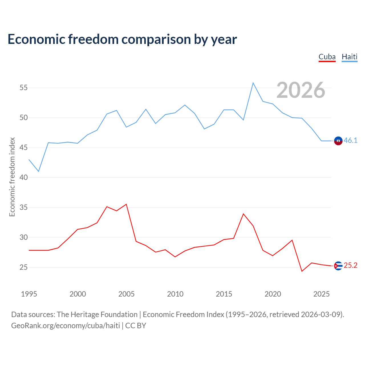 The Economic Freedom Index for Cuba is 25.2, ranking 195/197, compared to 46.1 for Haiti, ranking 178/197. The chart above displays a comparison of annual changes in economic freedom indexes.