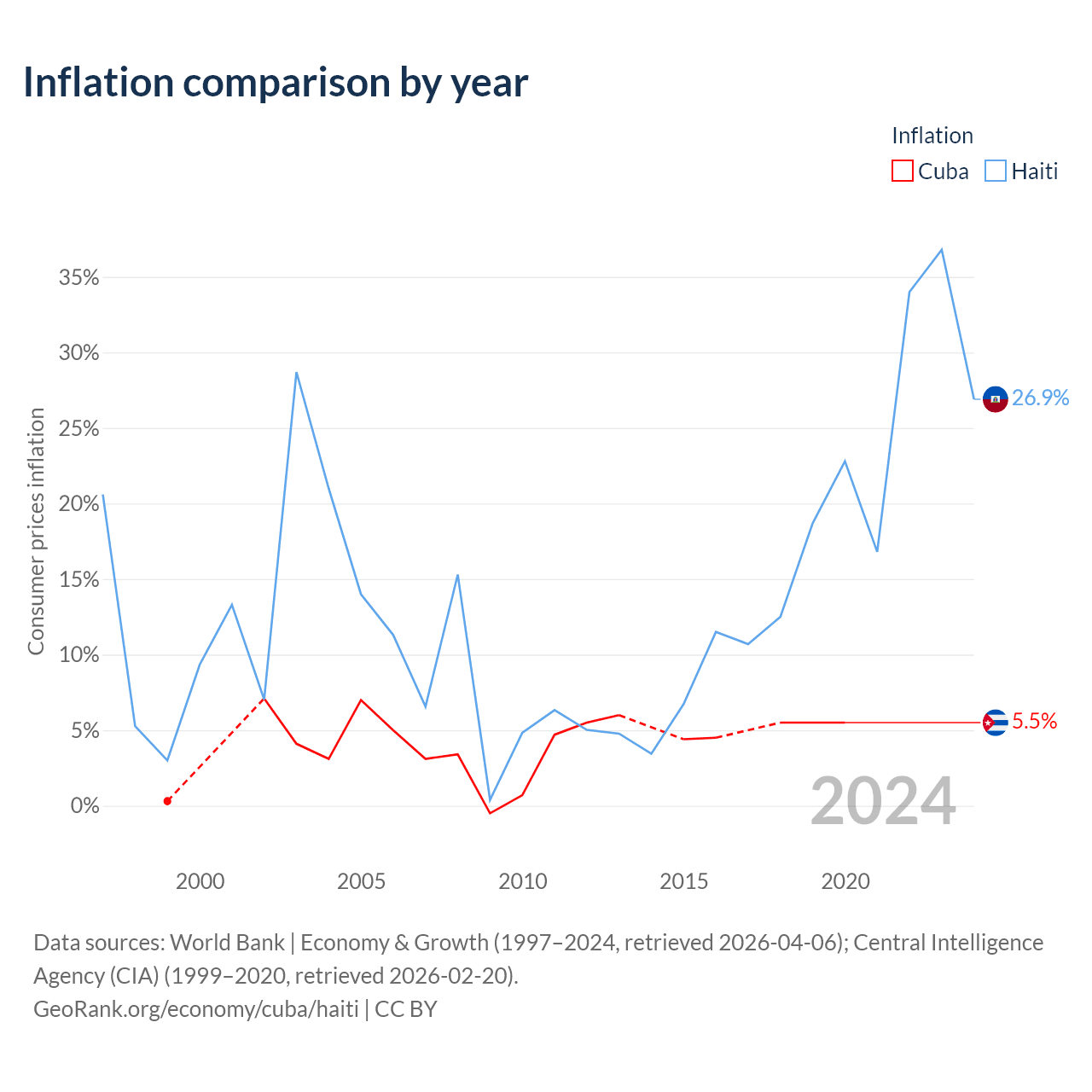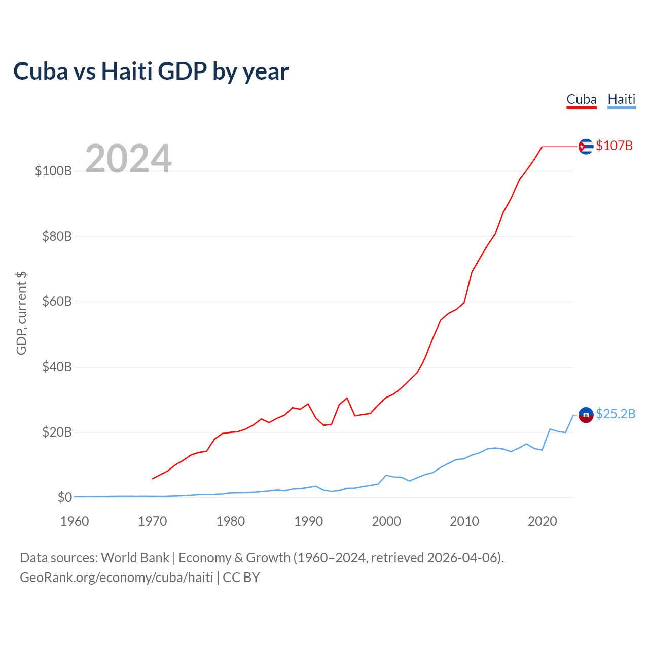 Cuba has a GDP of $107B compared to $25.2B for Haiti, ranking 69/197 and 117/197 by economy size, respectively.