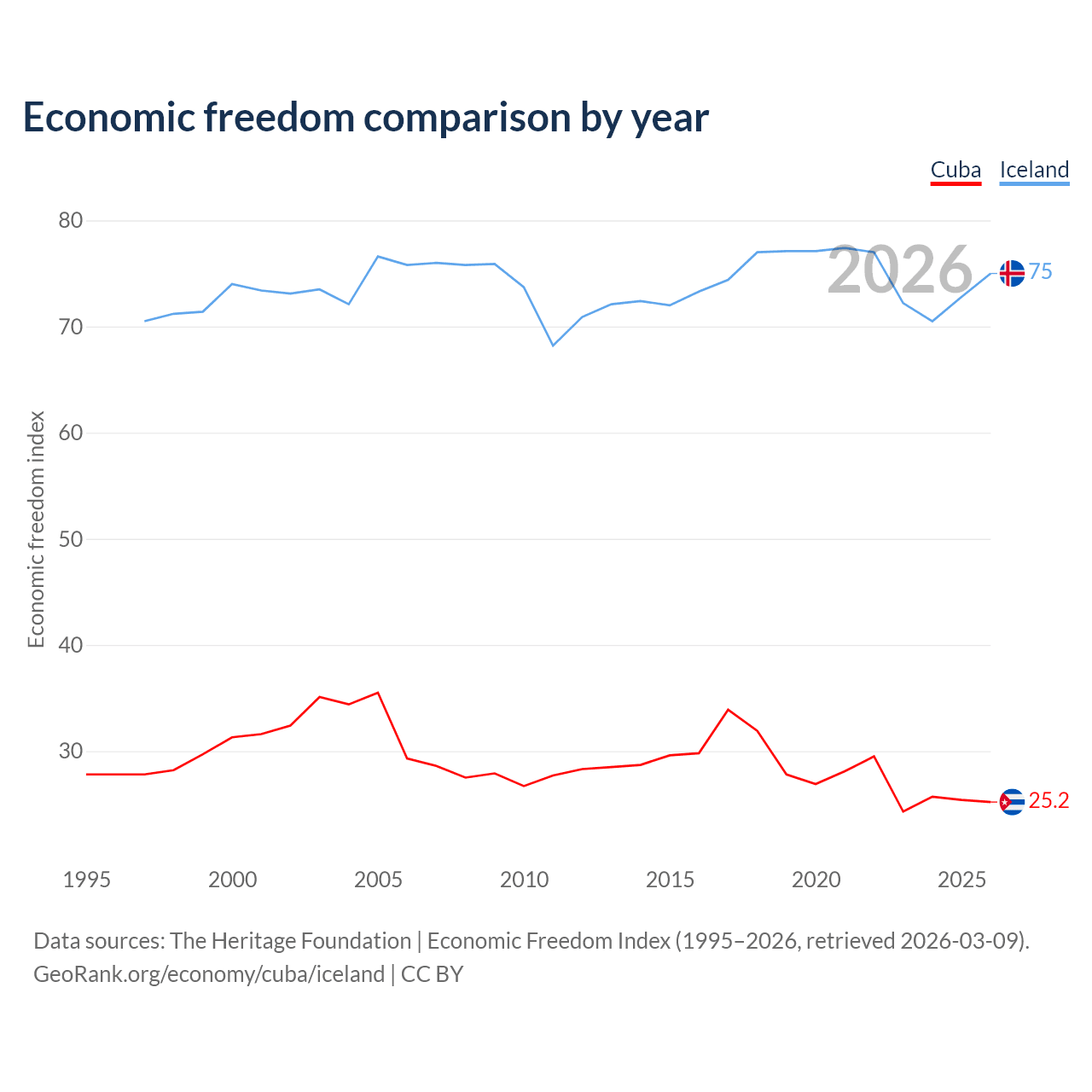 The Economic Freedom Index for Cuba is 25.2, ranking 195/197, compared to 75 for Iceland, ranking 19/197. The chart above displays a comparison of annual changes in economic freedom indexes.