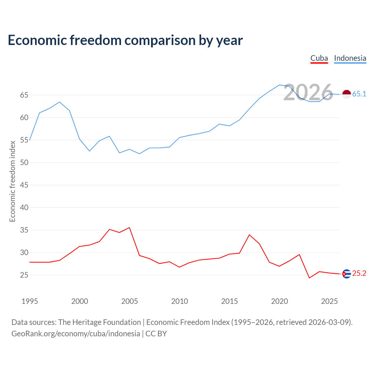 The Economic Freedom Index for Cuba is 25.2, ranking 195/197, compared to 65.1 for Indonesia, ranking 67/197. The chart above displays a comparison of annual changes in economic freedom indexes.
