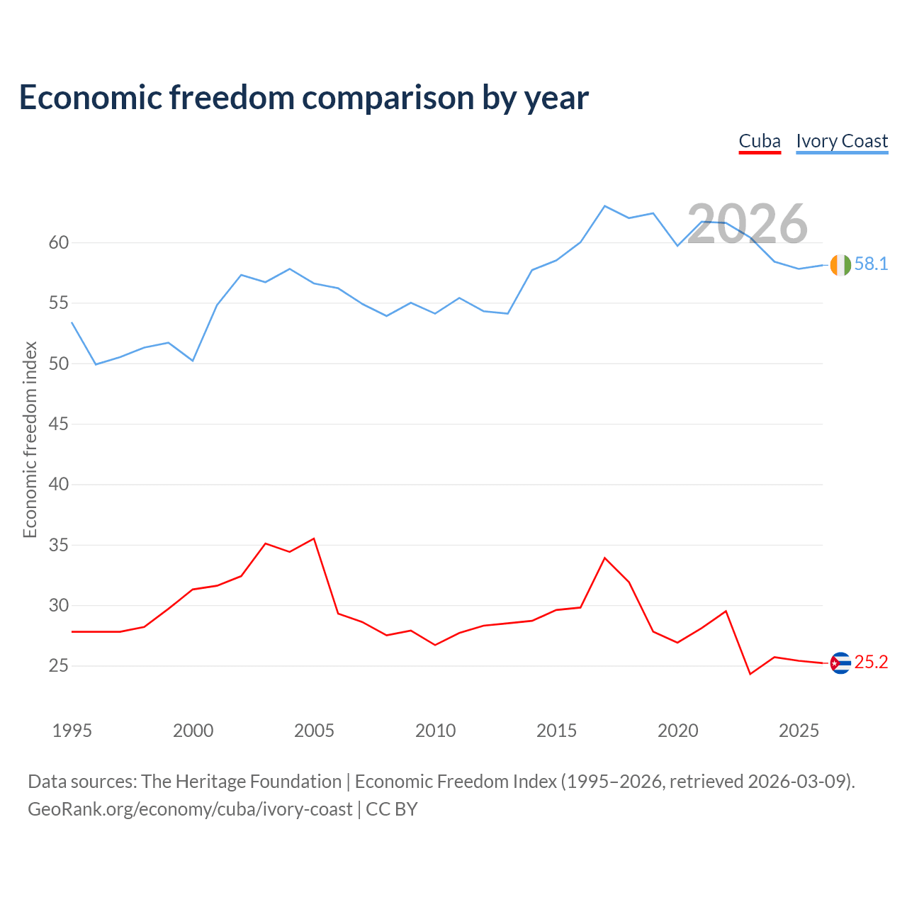 The Economic Freedom Index for Cuba is 25.2, ranking 195/197, compared to 58.1 for Ivory Coast, ranking 111/197. The chart above displays a comparison of annual changes in economic freedom indexes.