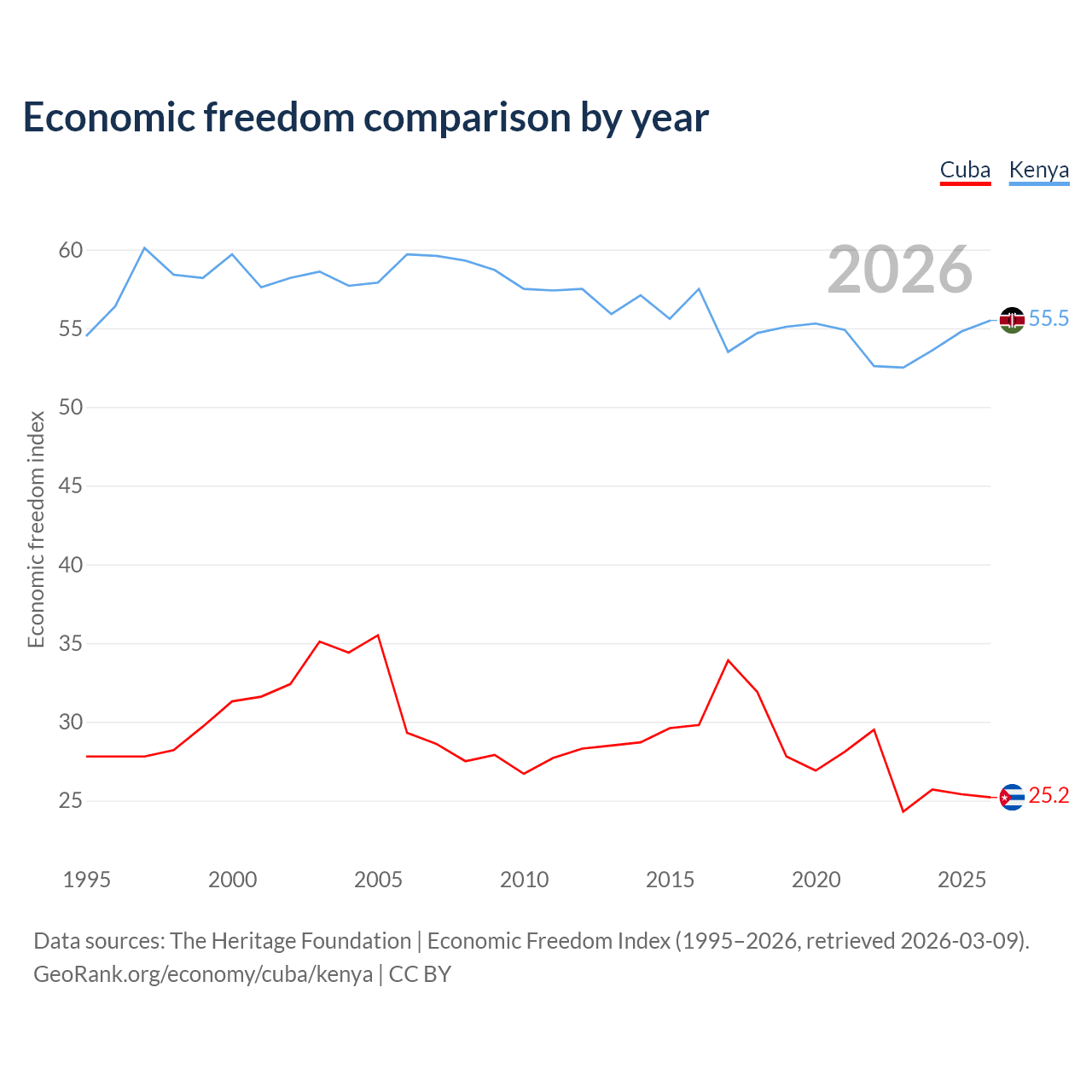 The Economic Freedom Index for Cuba is 25.2, ranking 195/197, compared to 55.5 for Kenya, ranking 128/197. The chart above displays a comparison of annual changes in economic freedom indexes.