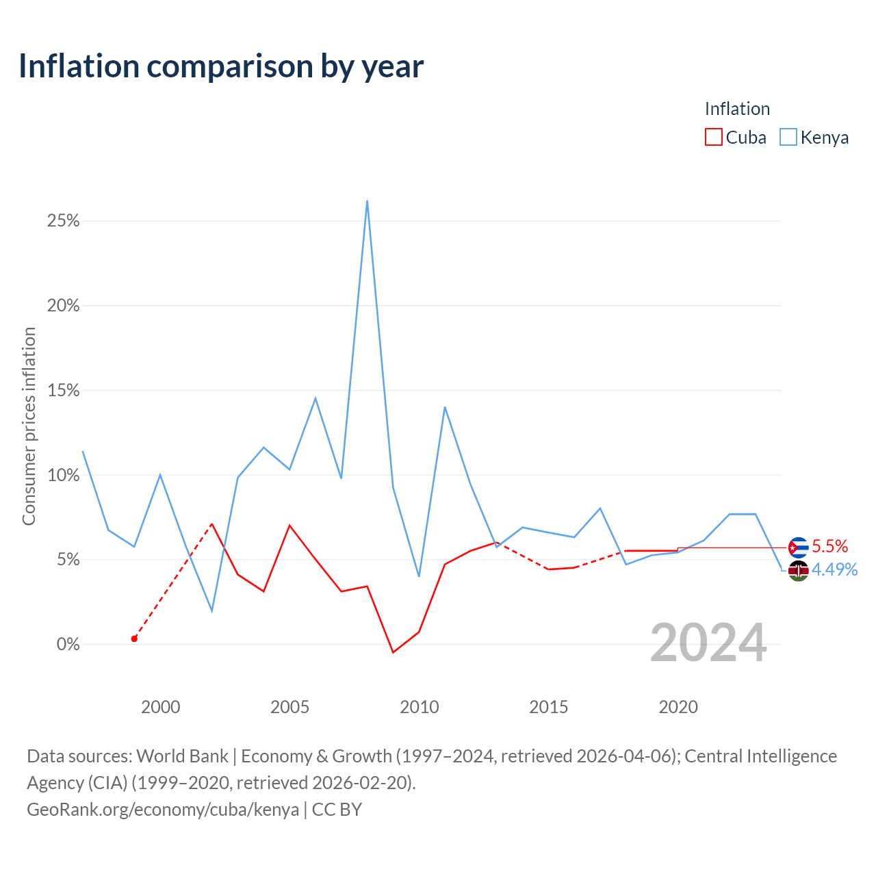 Cuba has a GDP of $107B compared to $120B for Kenya, ranking 69/197 and 64/197 by economy size, respectively.