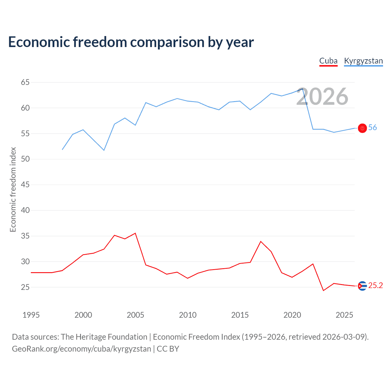 The Economic Freedom Index for Cuba is 25.2, ranking 195/197, compared to 56 for Kyrgyzstan, ranking 126/197. The chart above displays a comparison of annual changes in economic freedom indexes.