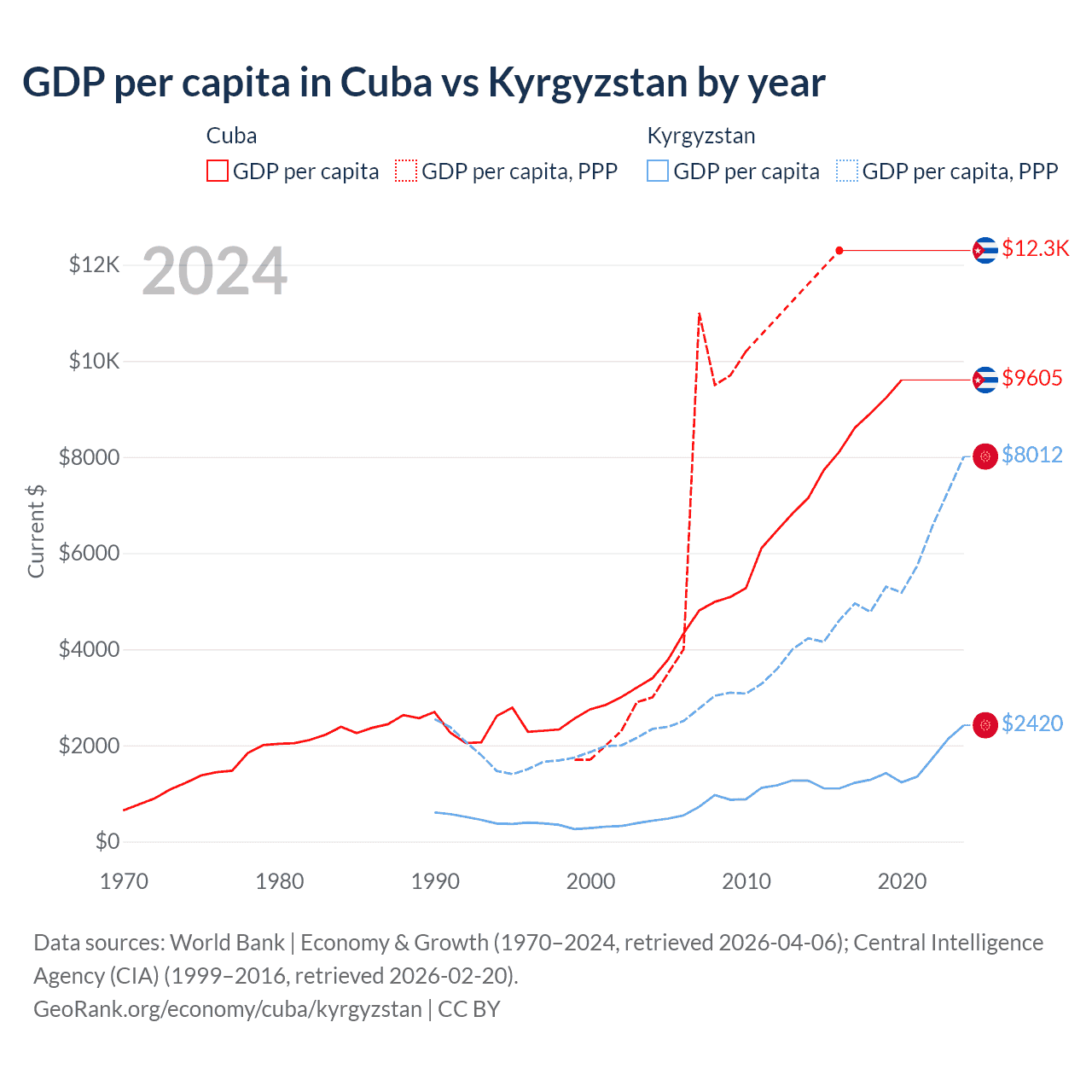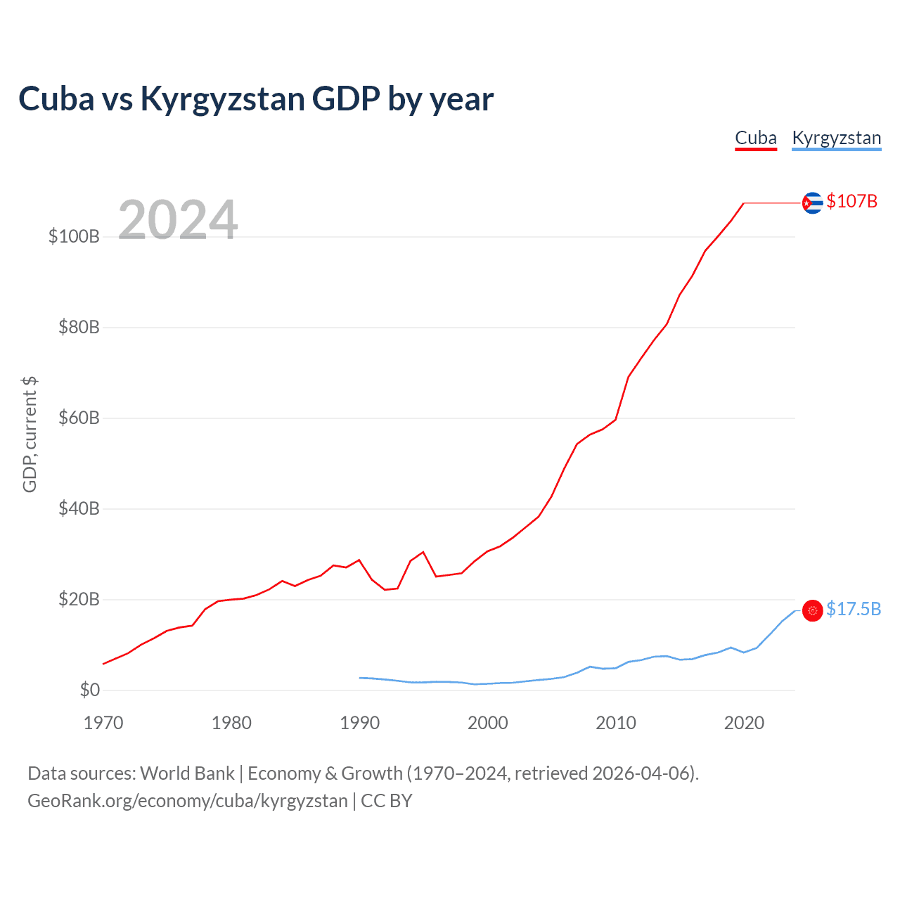 Cuba has a GDP of $107B compared to $17.5B for Kyrgyzstan, ranking 69/197 and 135/197 by economy size, respectively.
