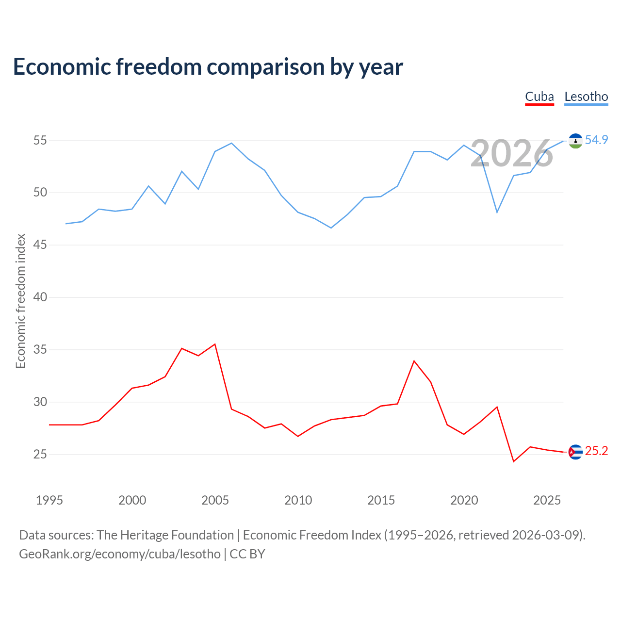 The Economic Freedom Index for Cuba is 25.2, ranking 195/197, compared to 54.9 for Lesotho, ranking 130/197. The chart above displays a comparison of annual changes in economic freedom indexes.