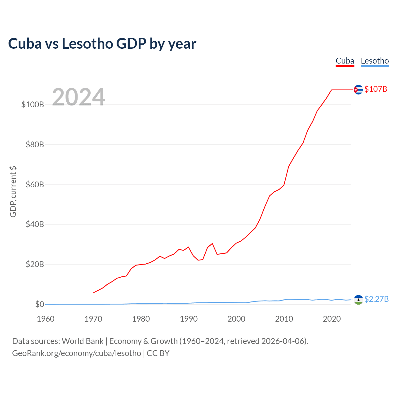 Cuba has a GDP of $107B compared to $2.27B for Lesotho, ranking 69/197 and 175/197 by economy size, respectively.