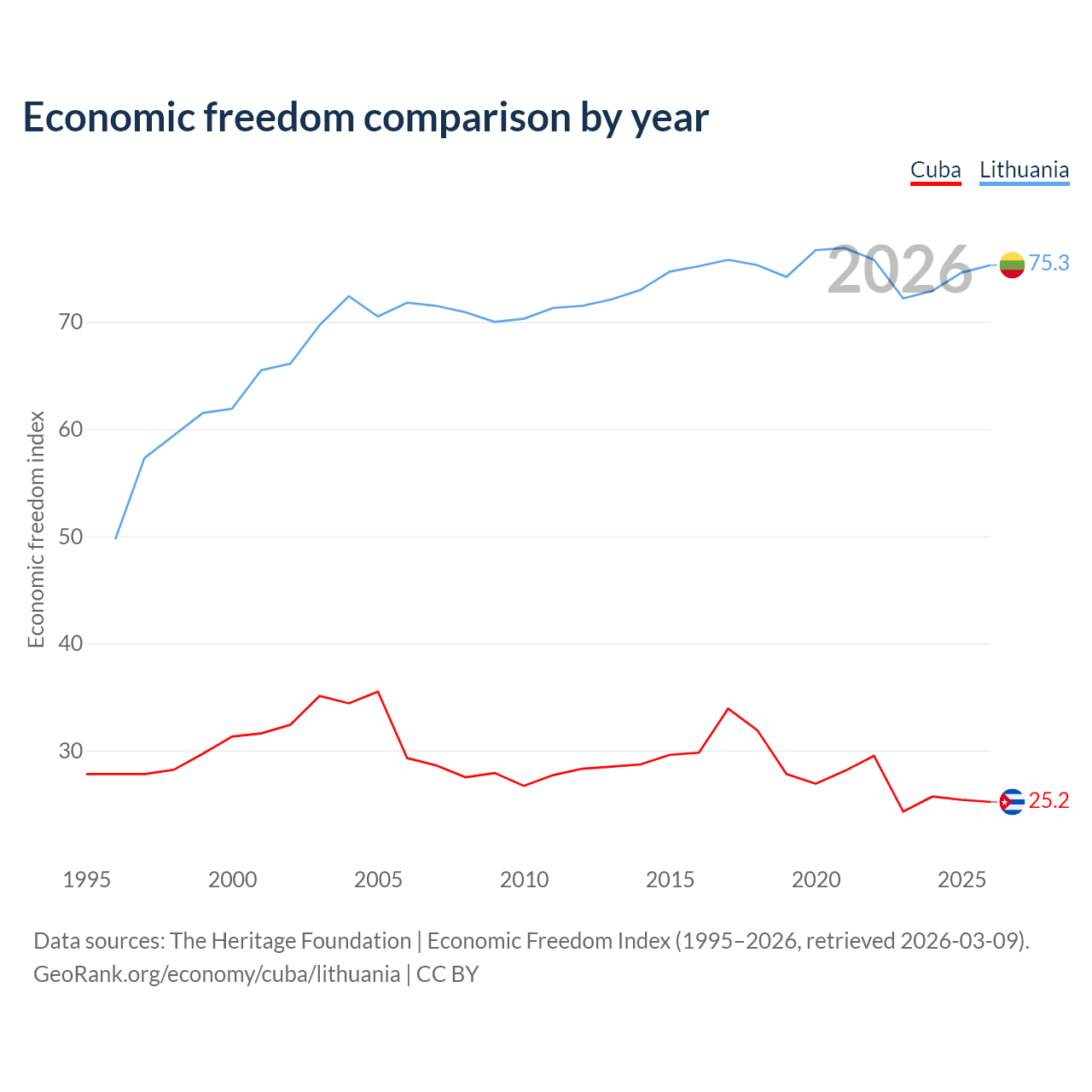 The Economic Freedom Index for Cuba is 25.2, ranking 195/197, compared to 75.3 for Lithuania, ranking 18/197. The chart above displays a comparison of annual changes in economic freedom indexes.