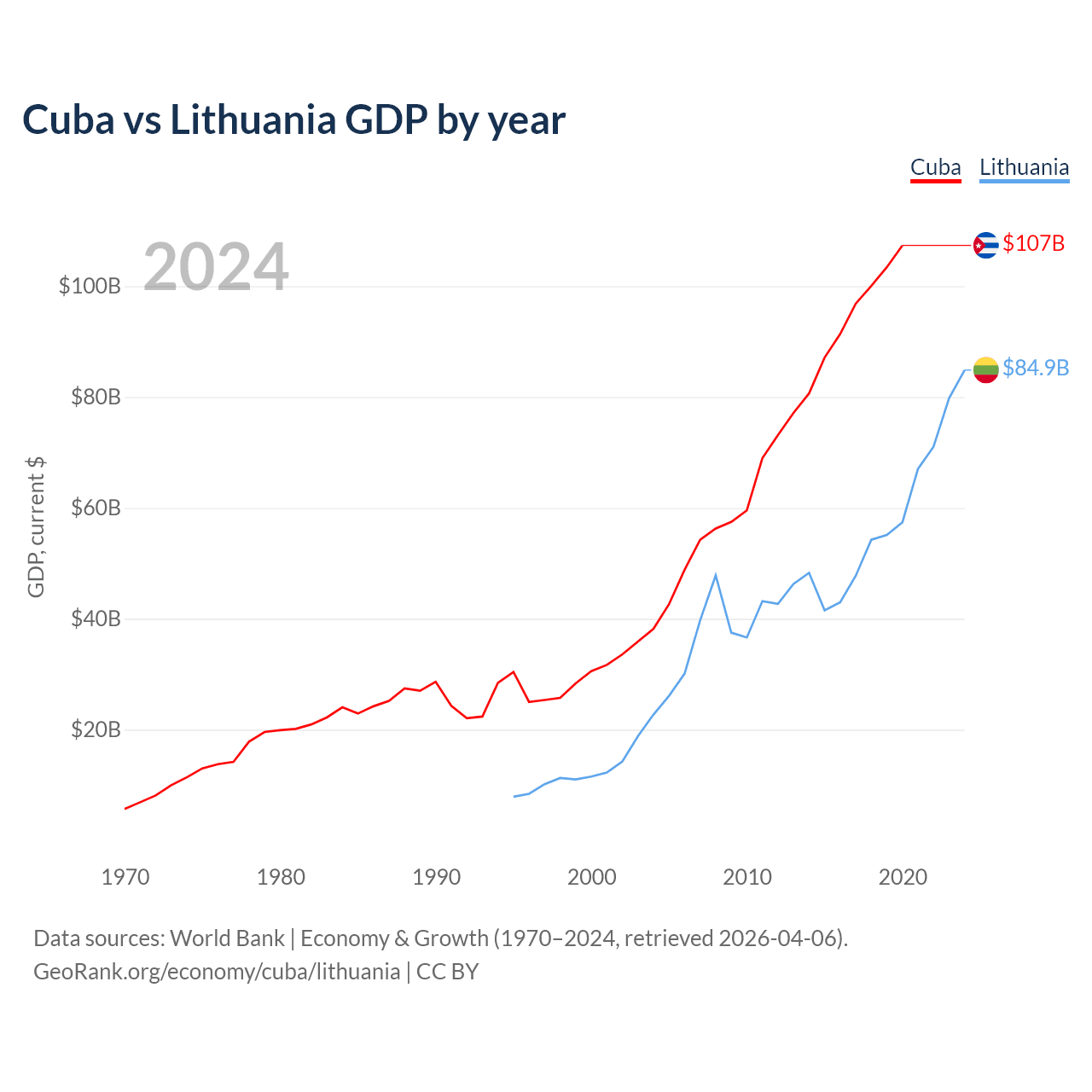 Cuba has a GDP of $107B compared to $84.9B for Lithuania, ranking 69/197 and 79/197 by economy size, respectively.