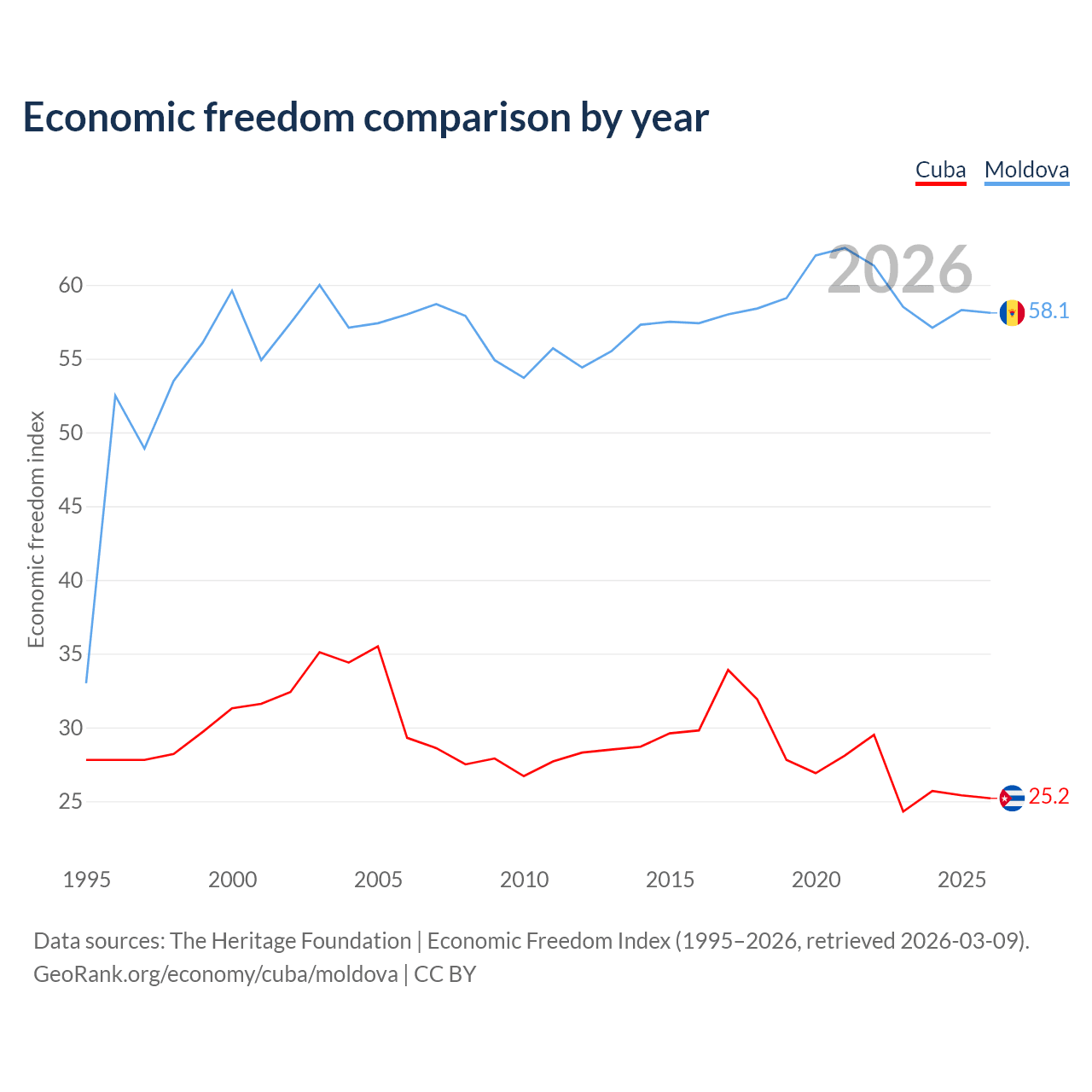 The Economic Freedom Index for Cuba is 25.2, ranking 195/197, compared to 58.1 for Moldova, ranking 112/197. The chart above displays a comparison of annual changes in economic freedom indexes.