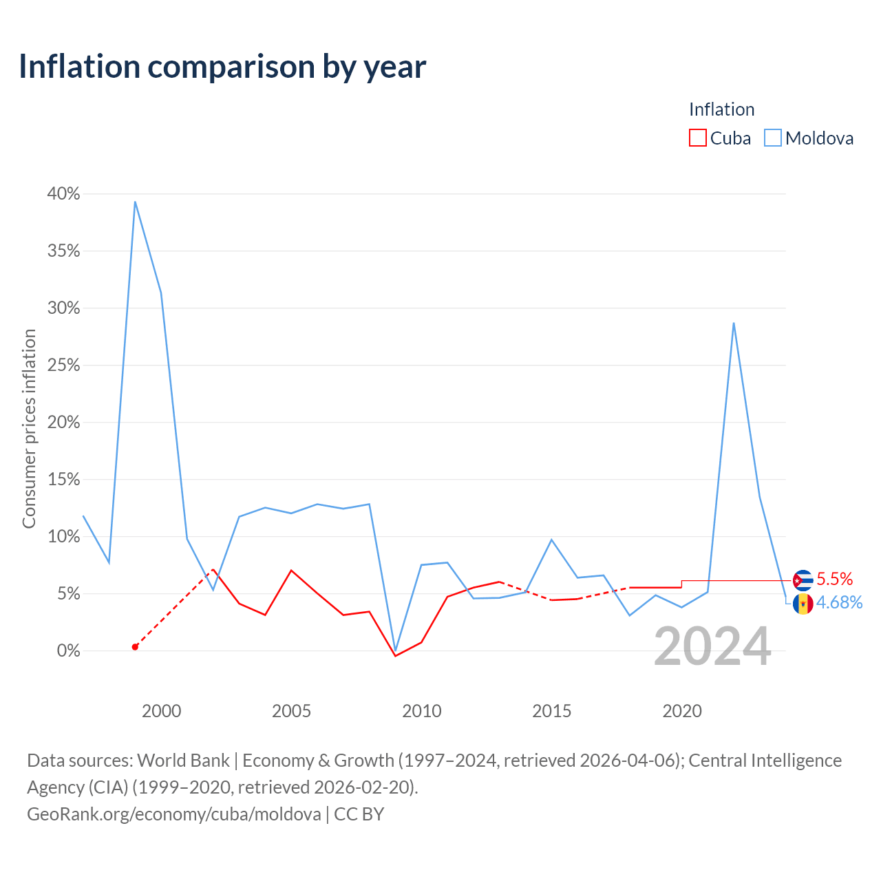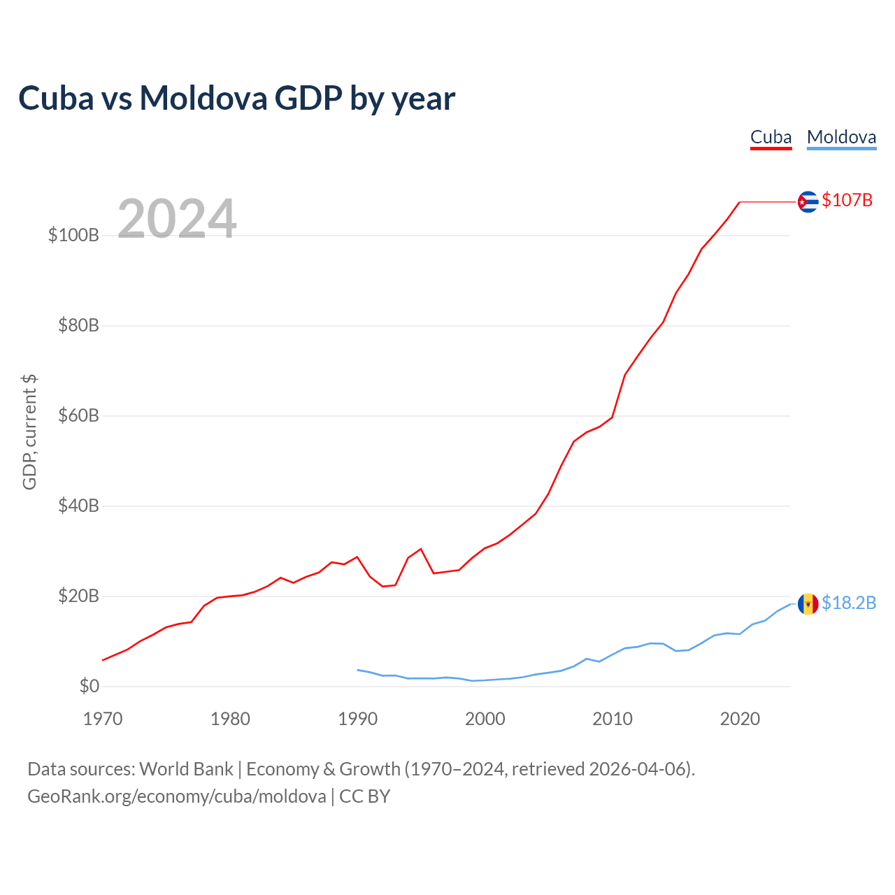 Cuba has a GDP of $107B compared to $18.2B for Moldova, ranking 69/197 and 134/197 by economy size, respectively.