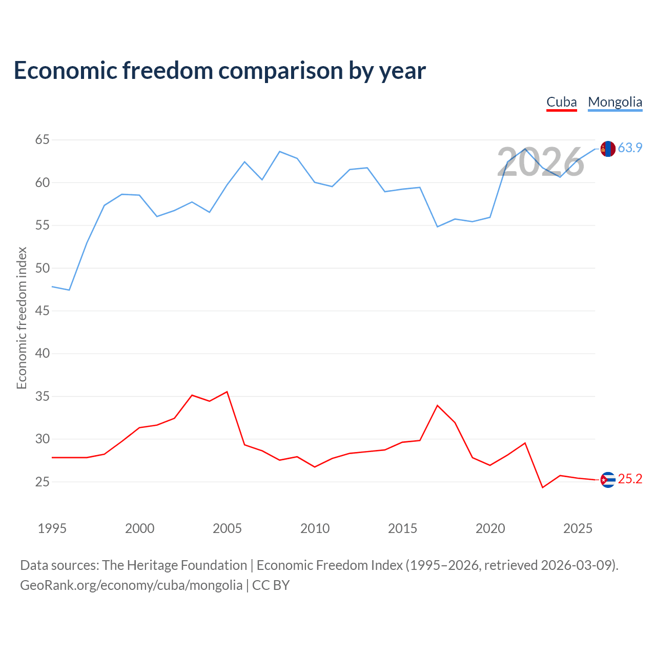The Economic Freedom Index for Cuba is 25.2, ranking 195/197, compared to 63.9 for Mongolia, ranking 76/197. The chart above displays a comparison of annual changes in economic freedom indexes.
