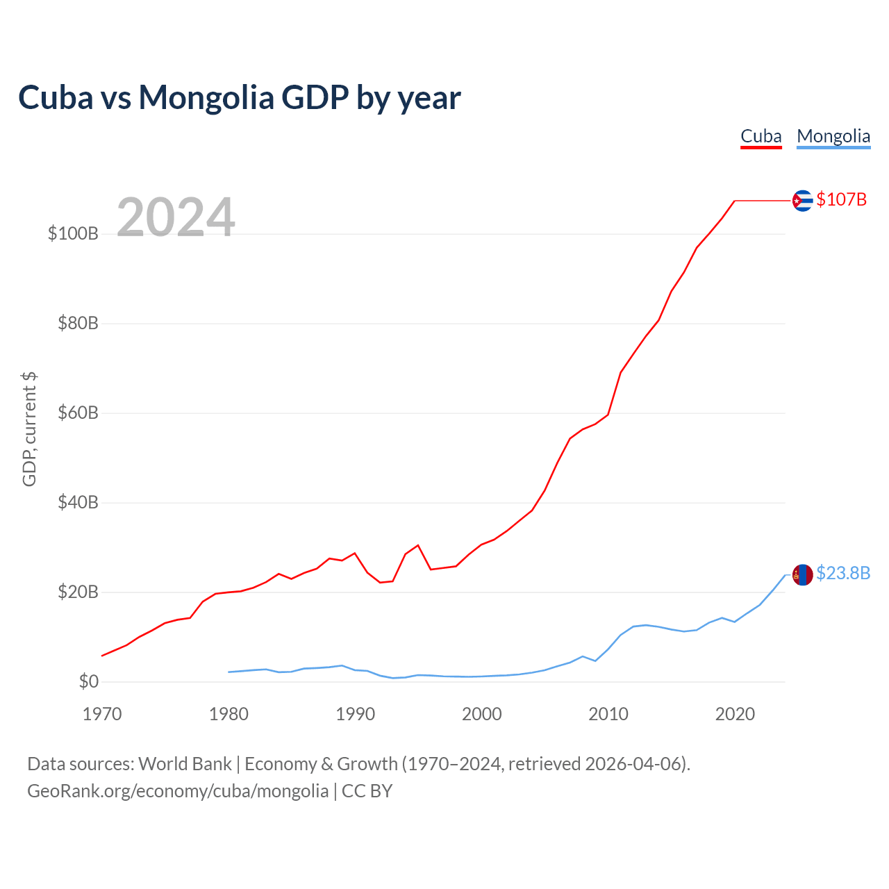 Cuba has a GDP of $107B compared to $23.8B for Mongolia, ranking 69/197 and 121/197 by economy size, respectively.