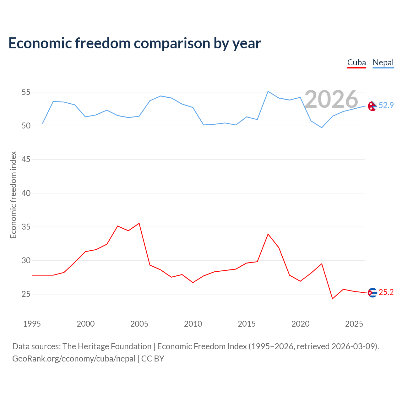 The Economic Freedom Index for Cuba is 25.2, ranking 195/197, compared to 52.9 for Nepal, ranking 144/197. The chart above displays a comparison of annual changes in economic freedom indexes.