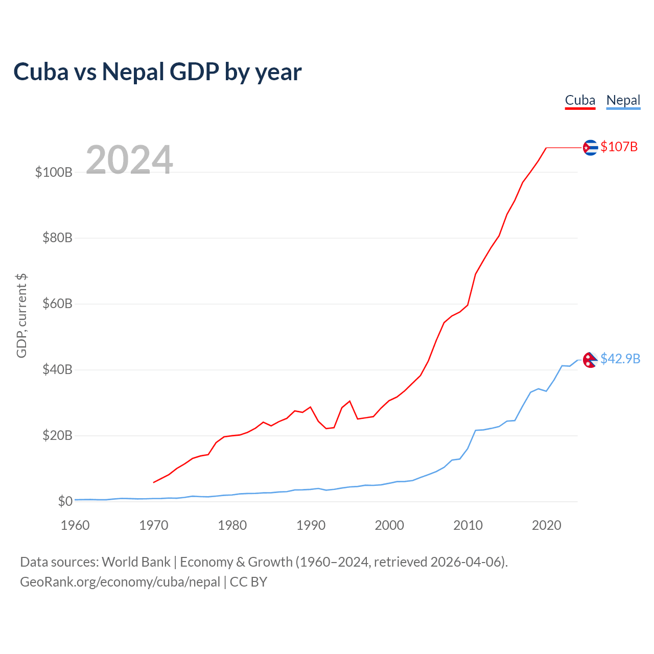 Cuba has a GDP of $107B compared to $42.9B for Nepal, ranking 69/197 and 101/197 by economy size, respectively.
