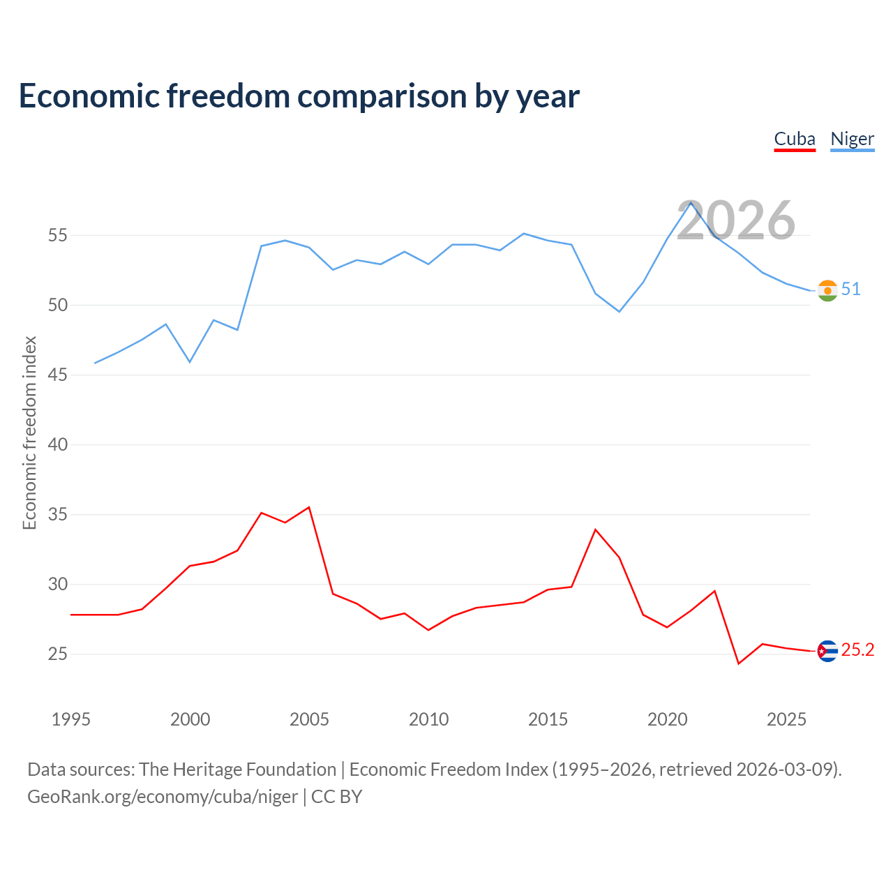 The Economic Freedom Index for Cuba is 25.2, ranking 195/197, compared to 51 for Niger, ranking 156/197. The chart above displays a comparison of annual changes in economic freedom indexes.