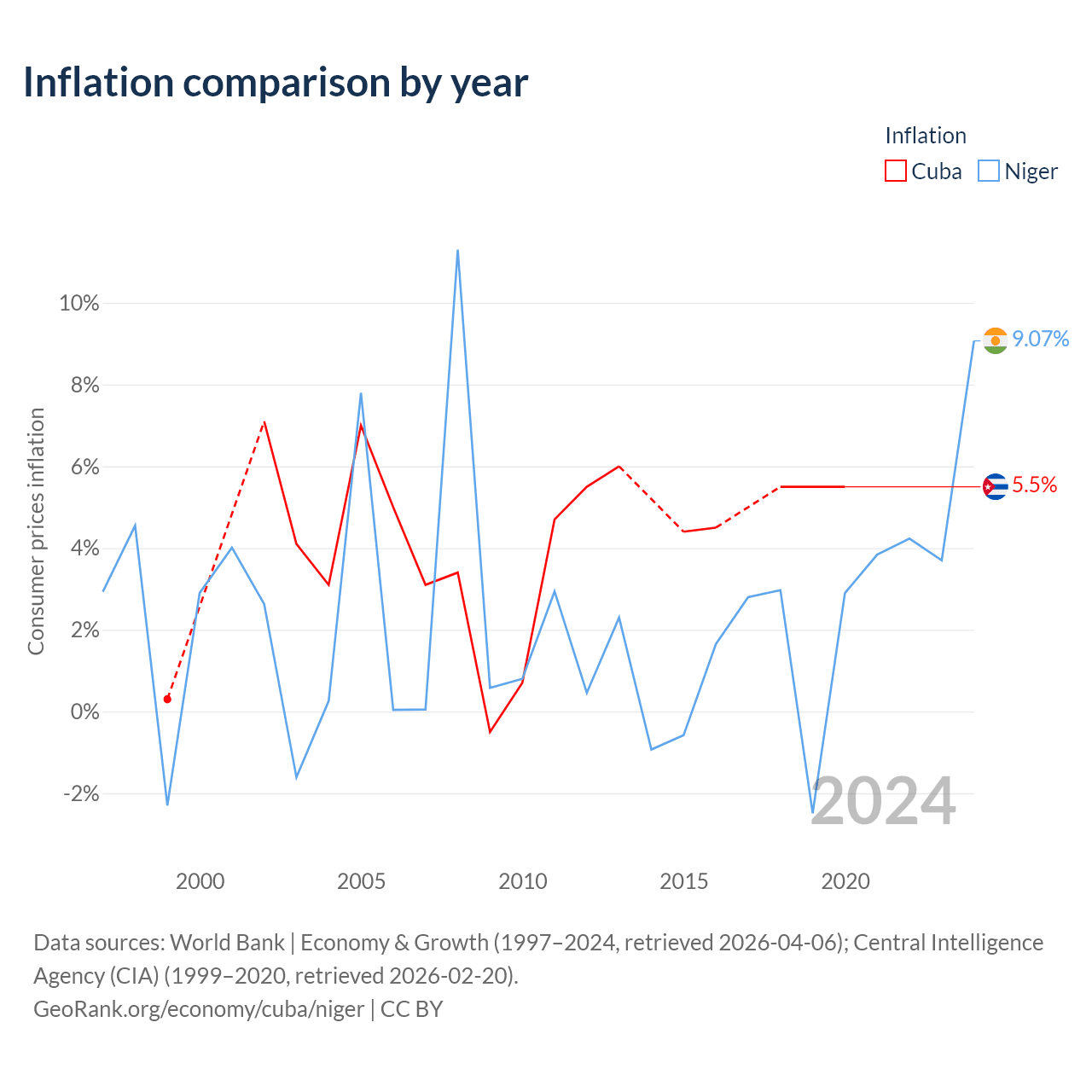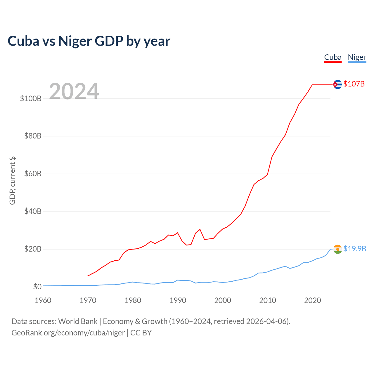 Cuba has a GDP of $107B compared to $19.9B for Niger, ranking 69/197 and 130/197 by economy size, respectively.
