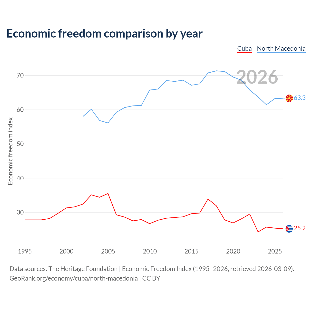 The Economic Freedom Index for Cuba is 25.2, ranking 195/197, compared to 63.3 for North Macedonia, ranking 81/197. The chart above displays a comparison of annual changes in economic freedom indexes.
